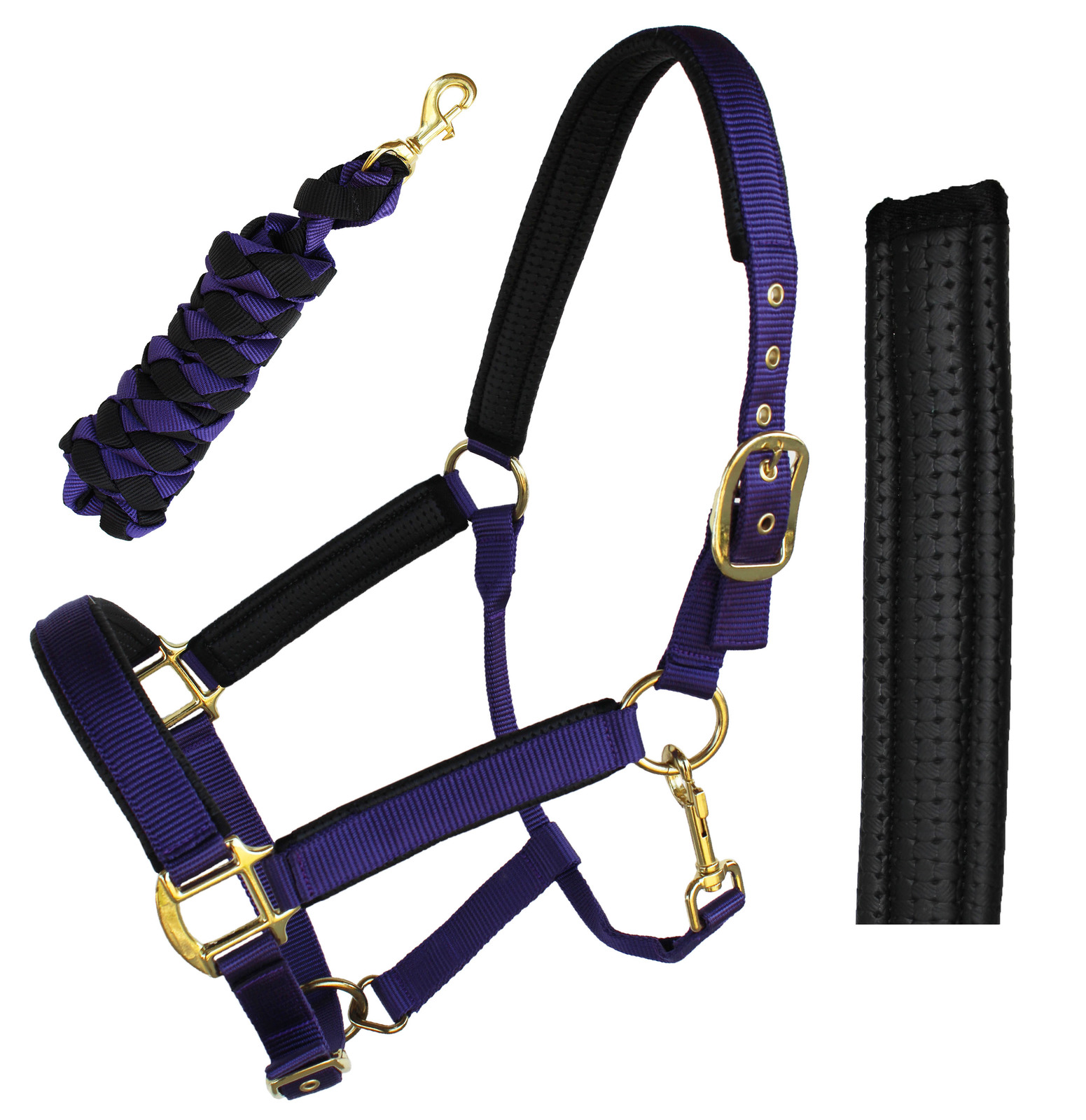 Challenger Neoprene Padded Nylon Horse Halter. Soft neoprene padded crown, noseband, and cheeks to help with rubbing. Washable material makes it easy to remove sweat, dirt, and debris. Great choice for everyday use. Heavy-duty solid brass hardware. Fully adjustable chin and crown. Includes matching 8' lead rope.