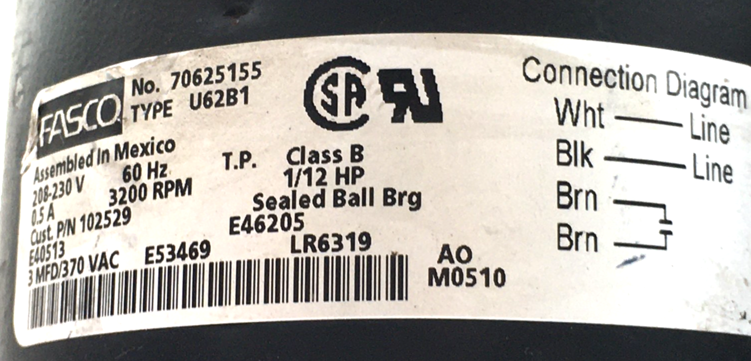 This is FASCO 70625155 Draft Inducer Blower Motor Assembly 102529 208-230V 3200 RPM 1/12 HP used part.