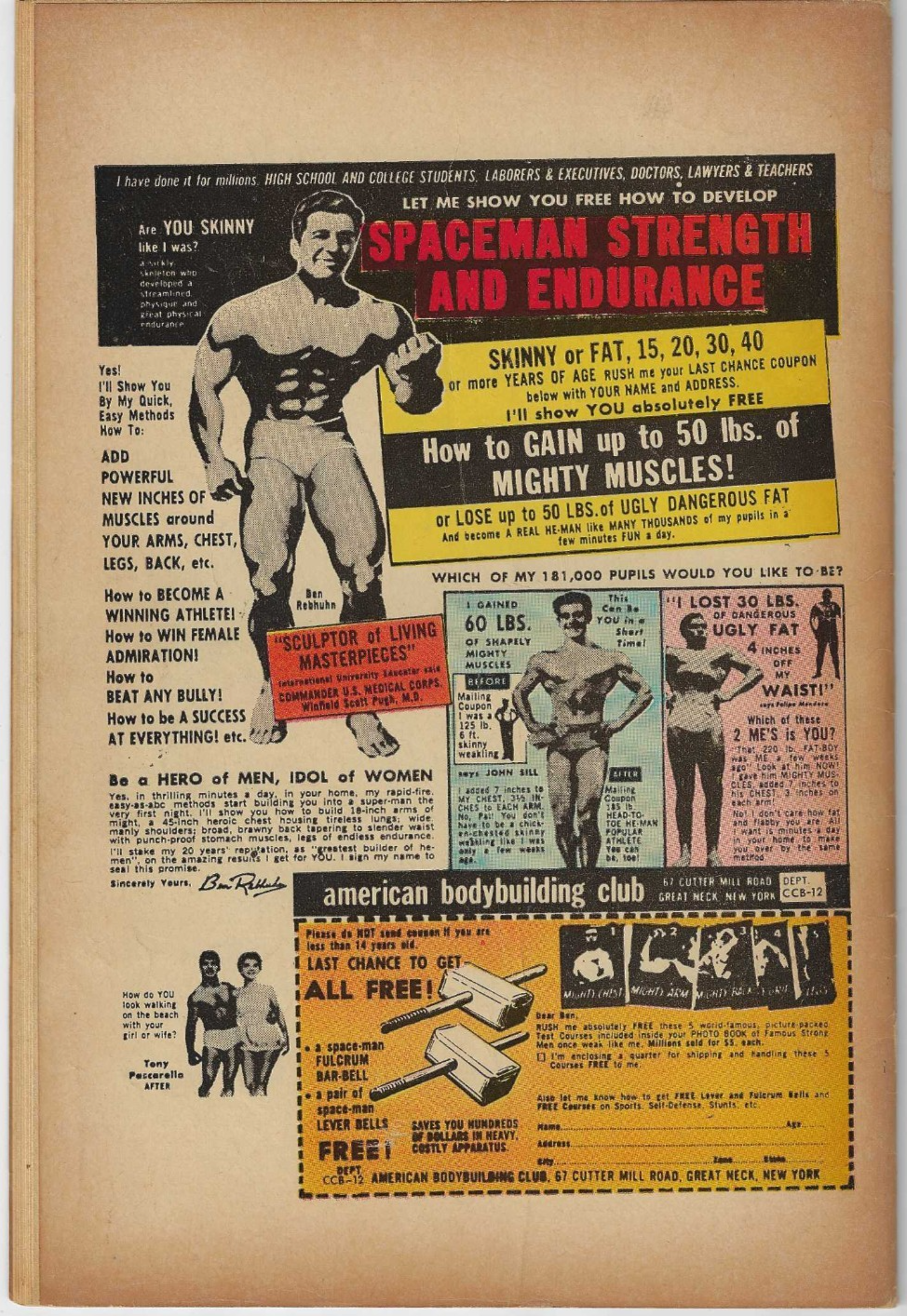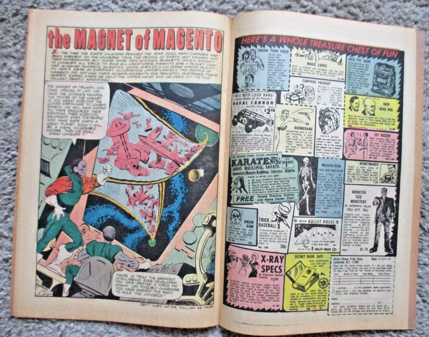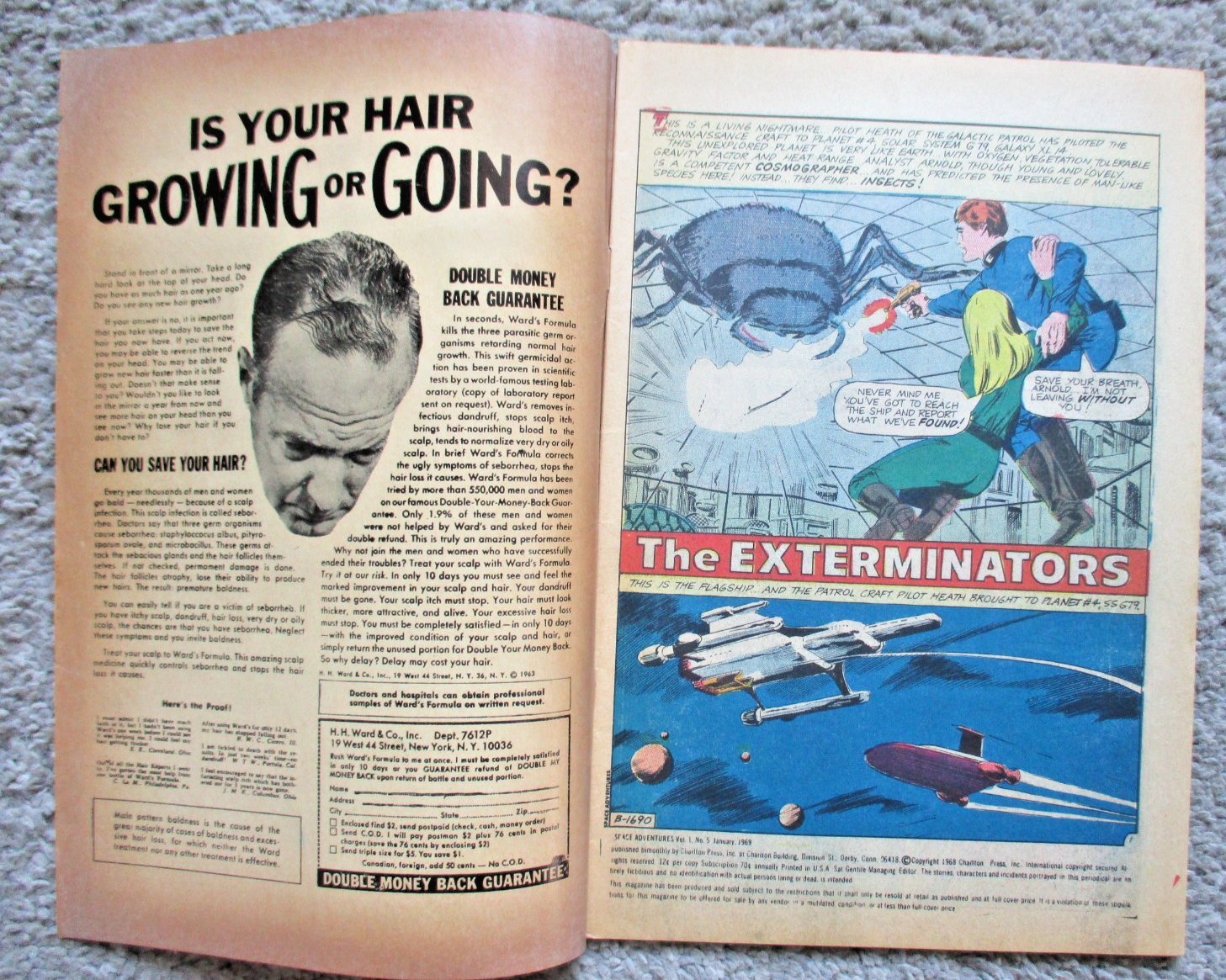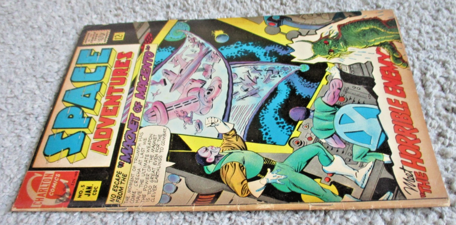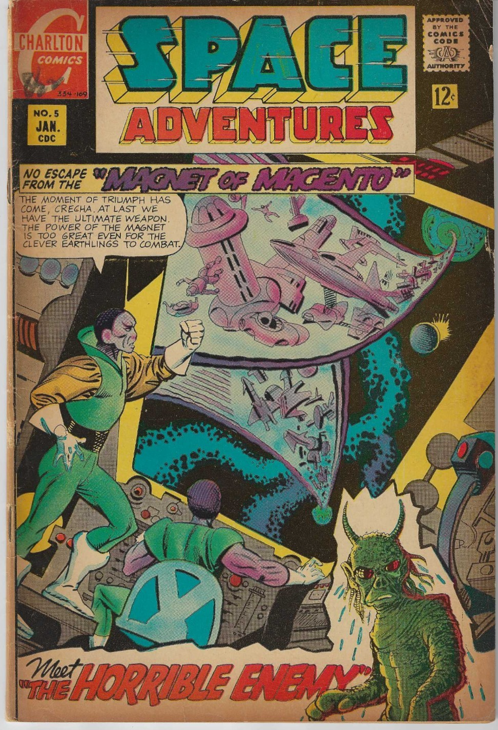 Cover by Steve Ditko and Sanho Kim. Stories and art by Steve Ditko, Joe Gill, Enio Leguizamon and Sanho Kim. Sometimes listed as Space Adventures #64. Sci-fi and super-heroics from Charlton Comics. Astronauts find a planet with the perfect atmosphere and environment for colonizing, with only one problem: gigantic bugs and insects. Aliens use a super-powerful magnet to attack the Earth, in a story (and cover) with early art by Spider-Man co-creator Steve Ditko. The Exterminators; Moon Madness; The Horrible Enemy!; The Magnet of Magento. 32 pages, Full Color. Cover price $0.12.