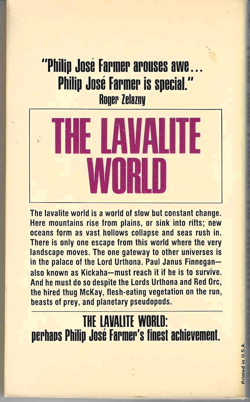 Vintage 282 page mass market paperback titled THE LAVALITE WORLD by Philip Jose Farmer/ Ace Books No. 47420-9, ISBN # 0-441-47420-9, First Ace Printing, December 1977/ World of Tiers Series Book 5. The lavalite world is a world of slow but constant change. Here mountains rise from plains, or sink into rifts; new oceans form as vast hollows collapse and seas rush in. There is only one escape from this world where the very landscape moves. The gateway to other universes is in the palace of the Lord Urthona. Paul Janus Finnegan ? also known as Kickaha ? must reach it if he is to survive. And he must do so despite Urthona and Red Orc, the hired thug McKay, flesh-eating vegetation on the move, and planetary pseudopods...