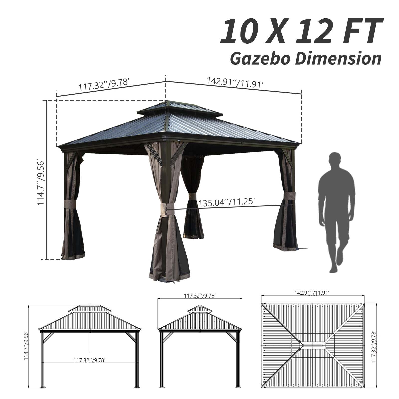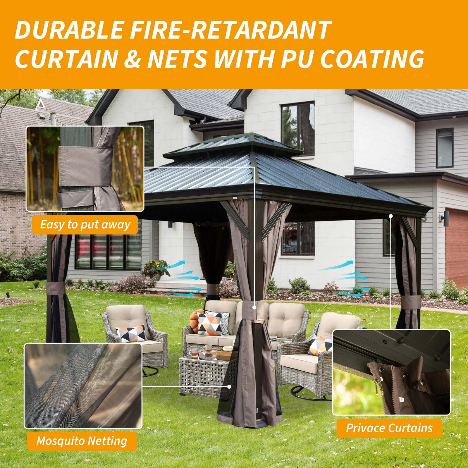 10'x12' Hardtop Metal Gazebo: Steel Roof, Drainage, Curtains, Netting, Brown