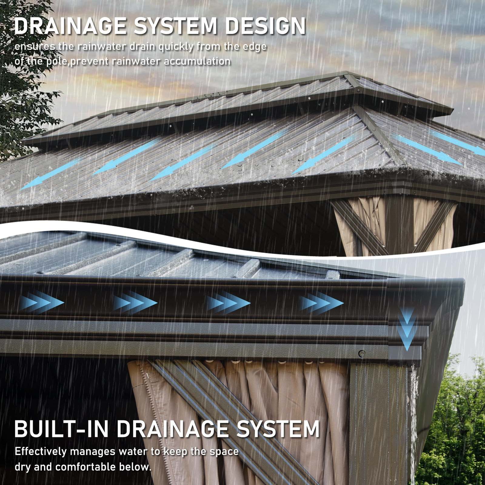 [Built-in Drainage System for a Dry, Comfortable Space] This metal gazebo features an innovative built-in drainage system that channels rainwater away, keeping your space dry and comfortable, even during rainy days. No more interruptions from rainfall?enjoy uninterrupted outdoor relaxation and entertainment all year long.