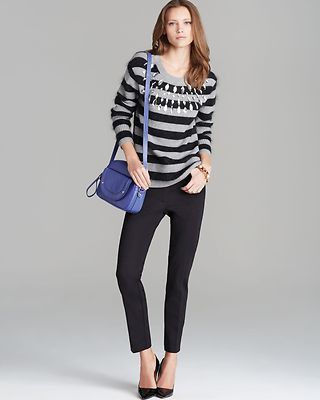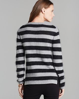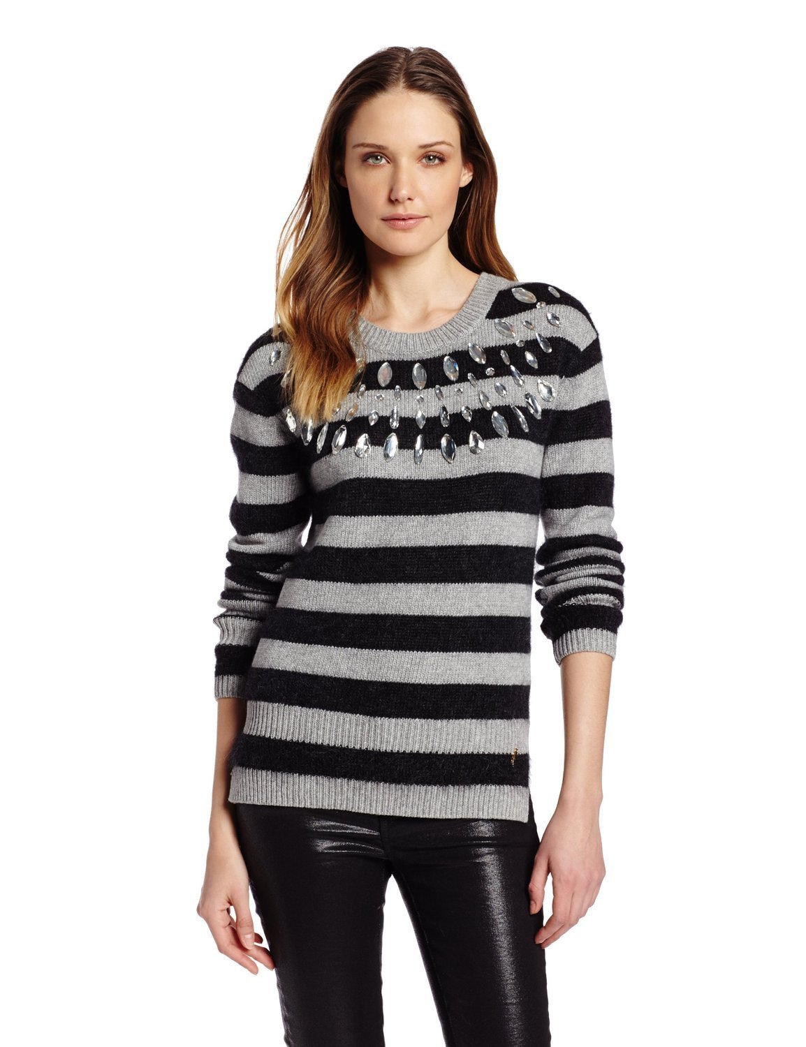Wool/polyamide/mohair/viscose/cashmere. Hand wash. Imported. Crew neck with rhinestone embellishment, long sleeves. Horizontal stripes, vented hem. Please refer to our juicy couture size chart. Color: Ashen Grey/Black