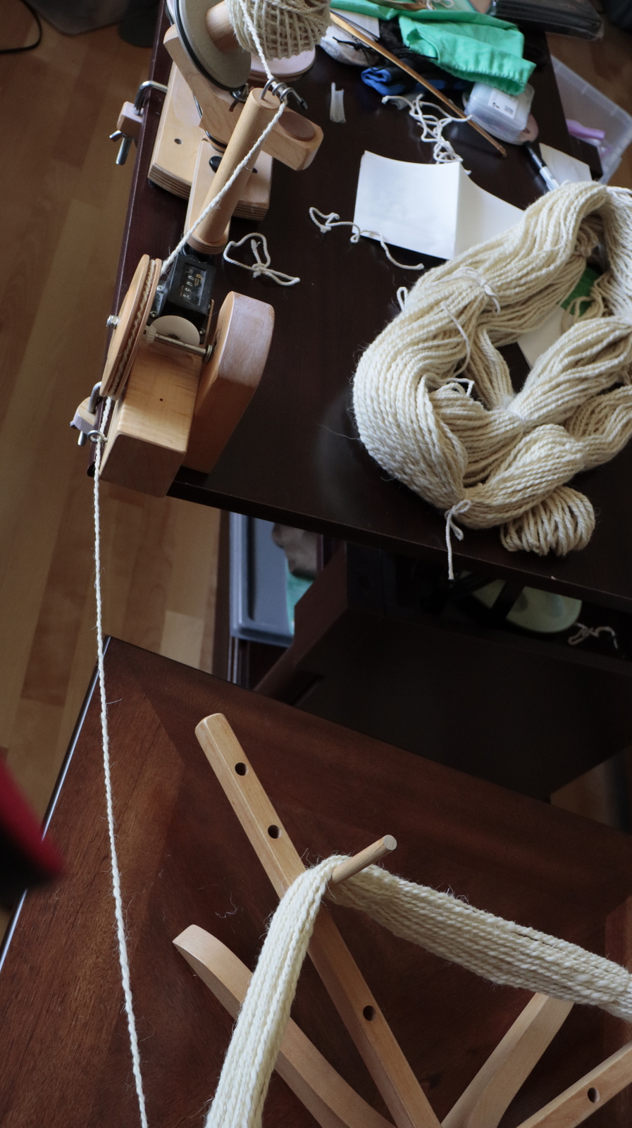 I begin by pulling the roving from the bag - that's a fancy term for spinnable wool- and set up at my Ashford Traveler wheel. After a few hours, there's quite a bit of single spin up nicely. But the work doesn't stop there - I then have to wind it off onto another bobbin and get ready for the next step.