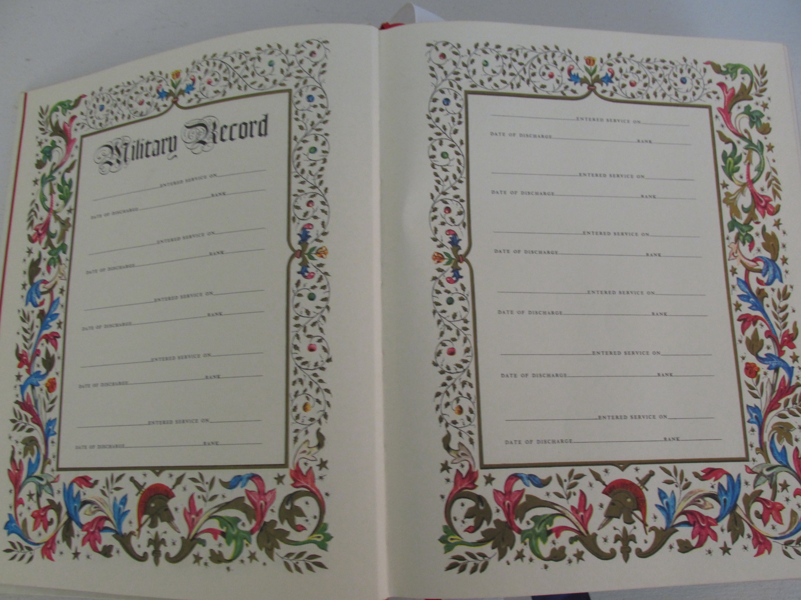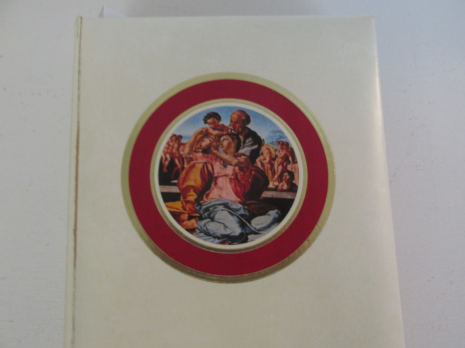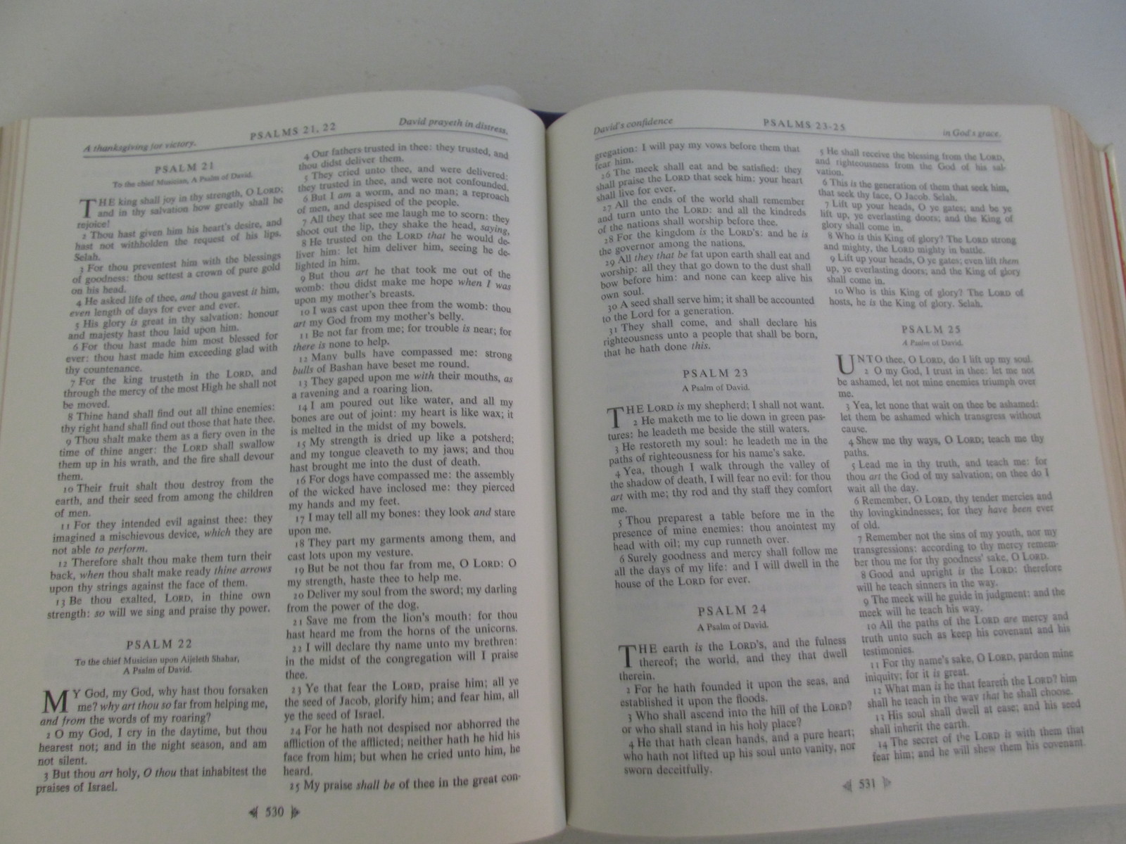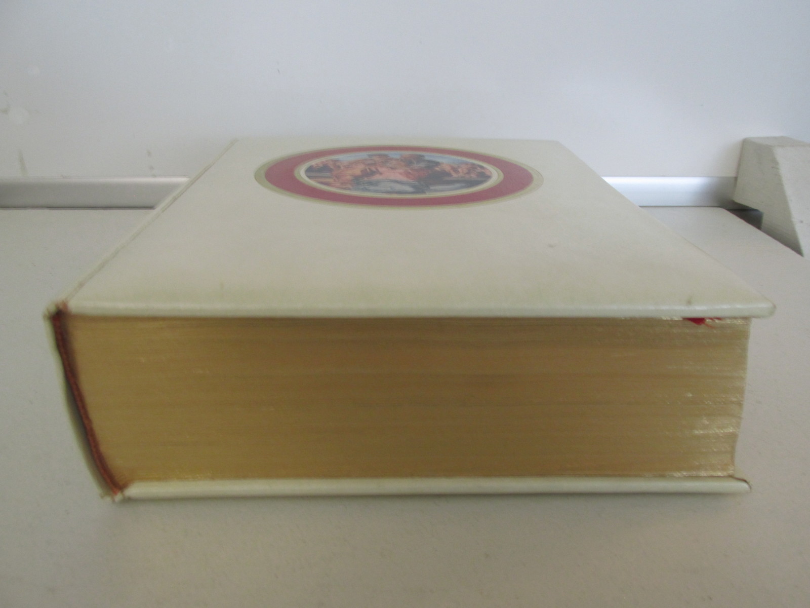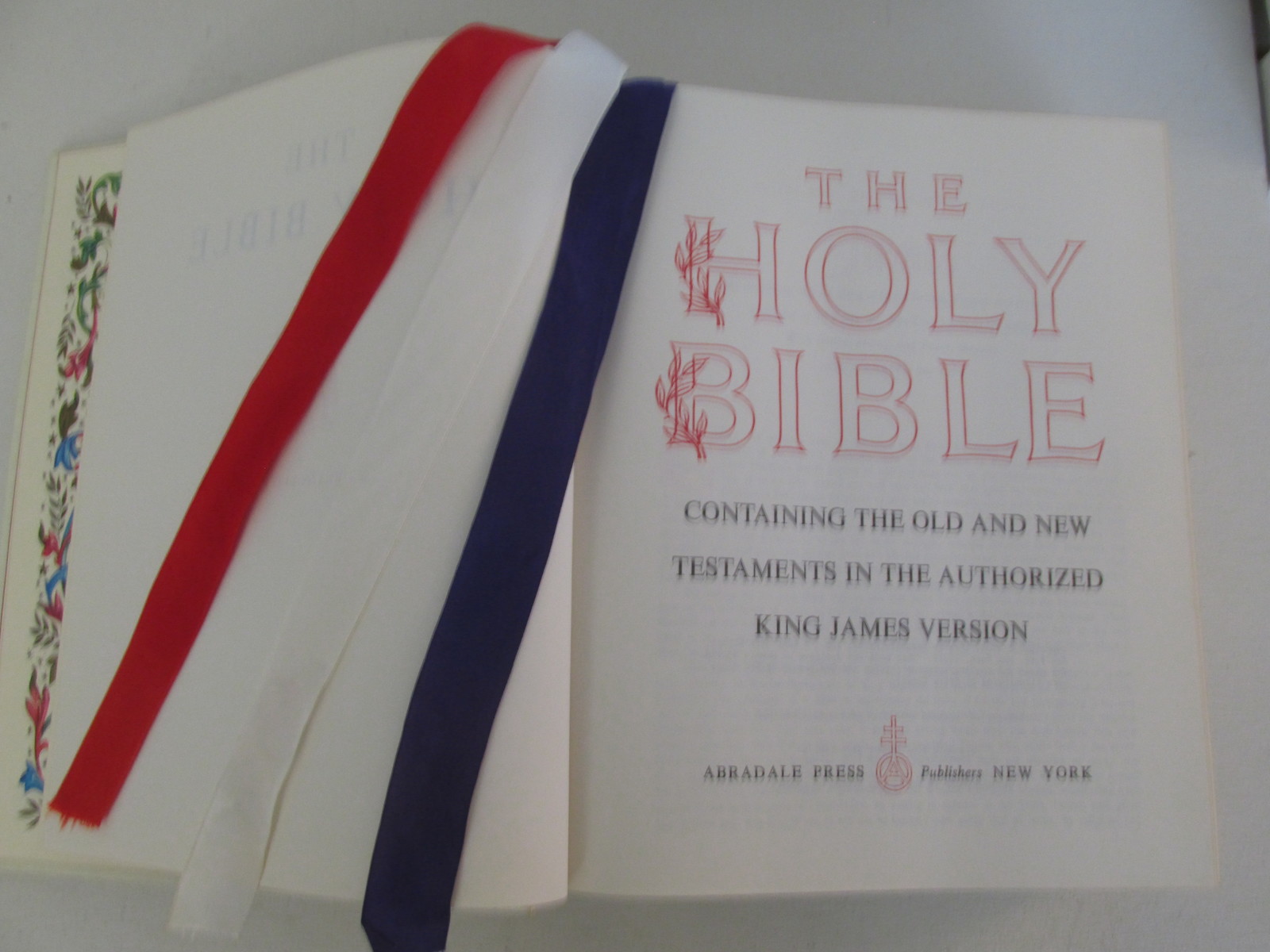 Beautifu, like new, Holy Bible, King James version. No writing or any damage to inside pages or outside cover. Has Marriages pages for your family history, Birth history, Confirmations, Deaths, and Military Records. This is a Michelangelo Edition. By Abradale Press, New York. Copyright 1969. Size is approx. 10 3/4" x 8 1/2" x 2 1/4". Goldleaf on edges of pages in good condition also. Some minor color loss where Bible opens on the bend where you open it up. I am a 80+ senior and the print in fine for me. Not as small as you would think for book this large. Many helpful references on the back pages.