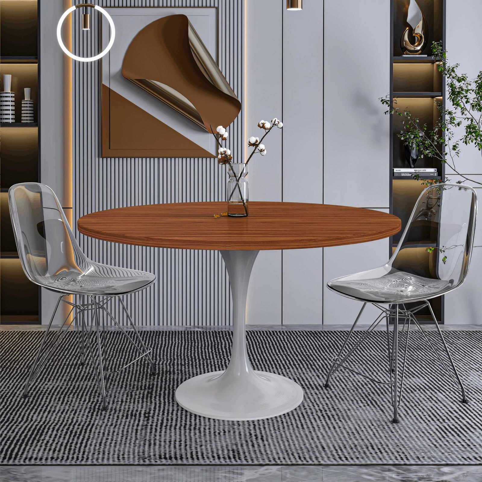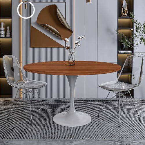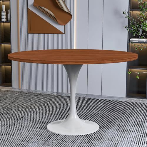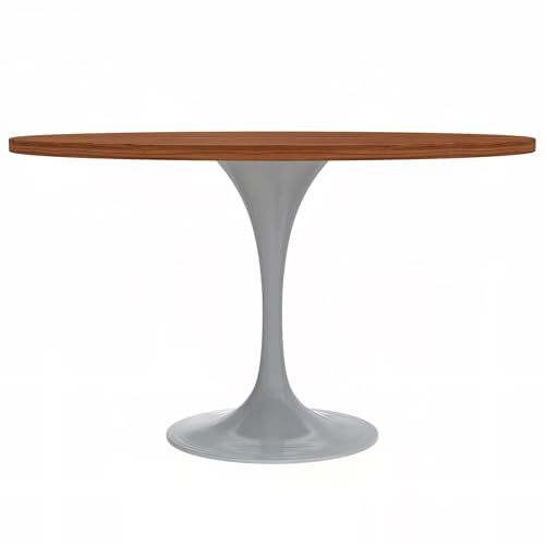 The central feature of the dining table revolves around its distinct 48-inch circular tabletop design. The circular form fosters a friendly ambiance, facilitating effortless conversation and ensuring a pleasant dining encounter. The tabletop is constructed from MDF wood, a state-of-the-art material valued for its resilience and refined aesthetic. MDF embodies a perfect balance of style and practicality, boasting an attractive appearance. Providing a sturdy foundation for the stylish tabletop is the white steel pedestal base. Steel is known for its durability, making it an ideal material for a piece of furniture that is meant to withstand the test of time. The steel base is adorned with a powder-coated finish in a pristine white color. The powder coating enhances the base's resistance to scratches and corrosion, ensuring that your table retains its polished look for years to come. The Dining Table features a well-proportioned round pedestal base. Beyond its stability, this design choice contributes to the overall aesthetic of the table creating a dining space that is both inviting and visually appealing. A quick spot clean with a dry cloth is all that is required to keep the dining table free from dust, spills, and stains. This easy maintenance routine allows you to enjoy the beauty of the table without the hassle of extensive cleaning. The package includes comprehensive instructions along with all the necessary hardware. With minimal effort, you can have this stunning dining table assembled and ready for use.