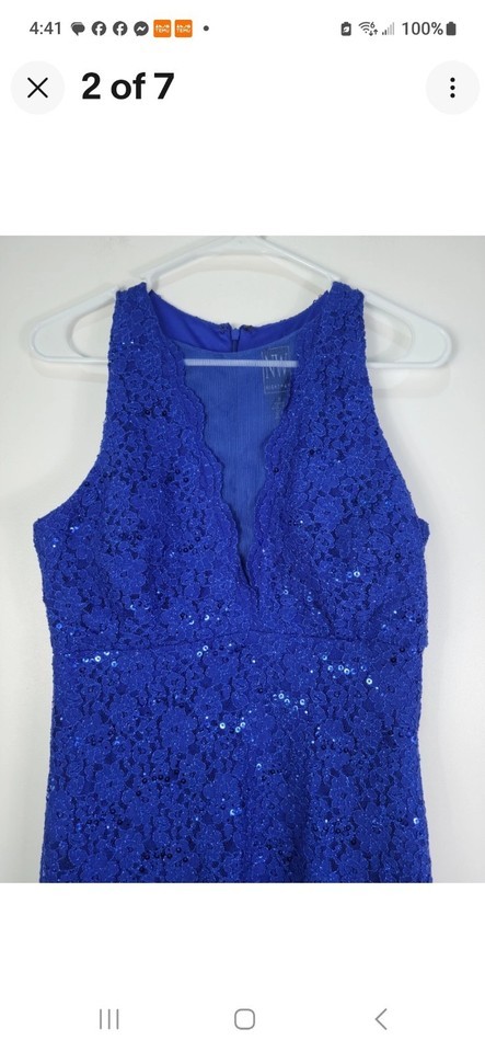 Nightway Womens Dark Blue Sequined Lace Illusion Neck Cocktail Sheath Dress Sz 8. Condition is Pre-owned - Excellent. Shipped with USPS Ground Advantage.