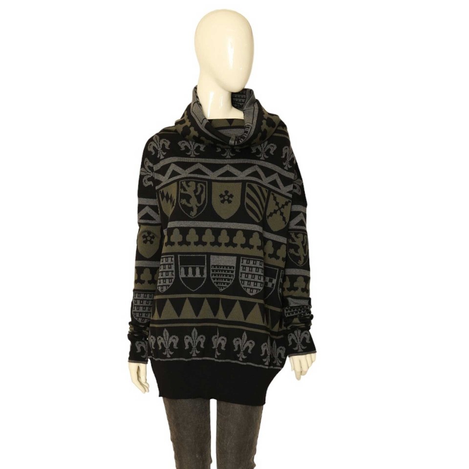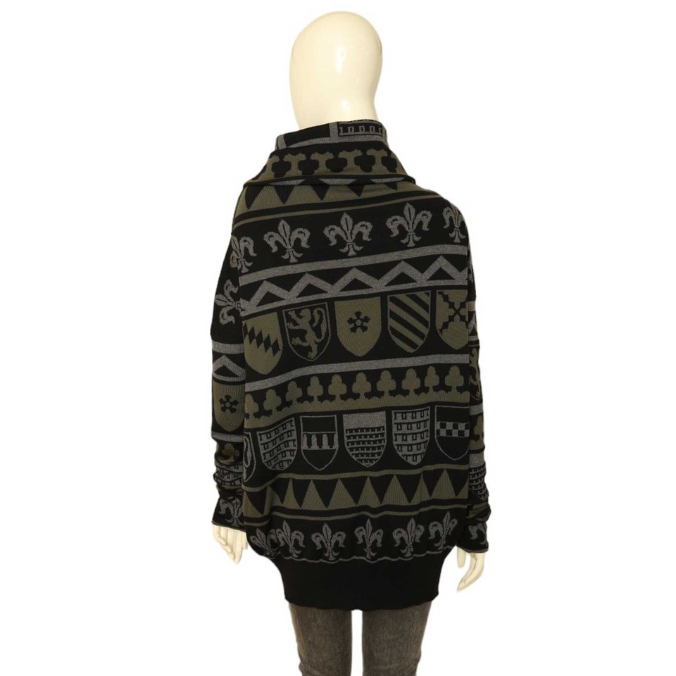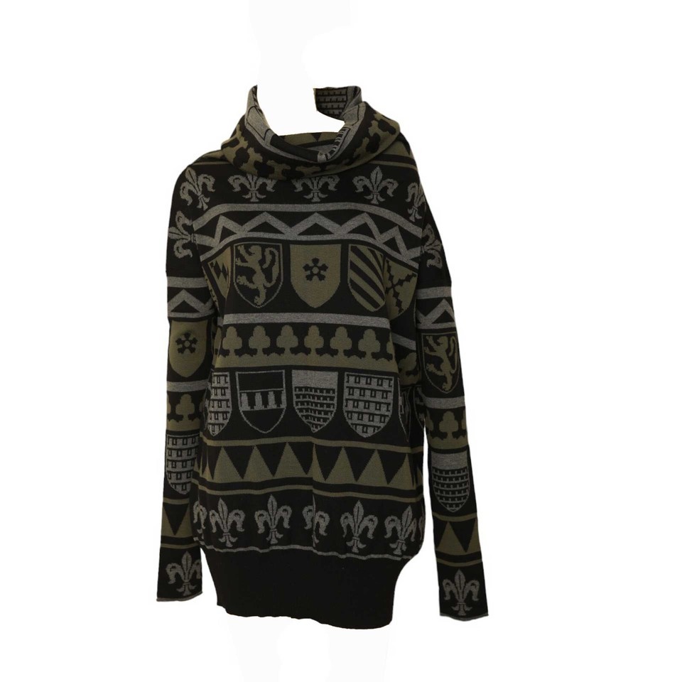 Beautiful and stylish Stella McCartney knit top! This designer fashion item will be a very special addition to your wardrobe. It features luxurious wool- cashmere knit with medieval emblems pattern in black, gray and khaki colors, cowl neck and long sleeves. Combine this stunning top with a pair of trousers and feel wonderful all day long!
