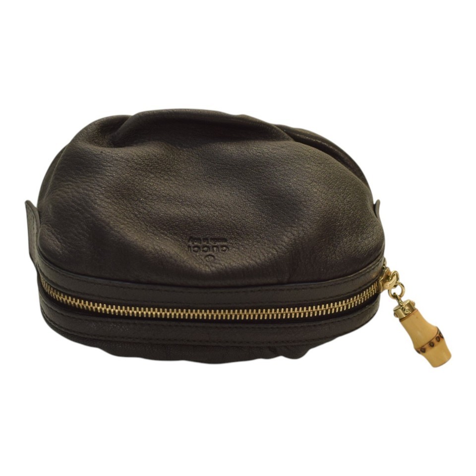 Add a touch of timeless elegance to your accessories collection with this authentic Gucci clutch bag. Crafted in Italy from supple, high-quality black leather, this piece features the brand?s iconic bamboo zipper pull in natural wood, a hallmark of Gucci?s craftsmanship since the 1940s.