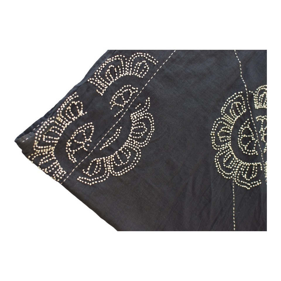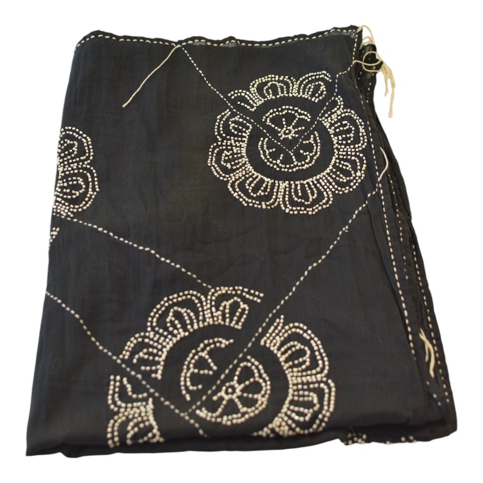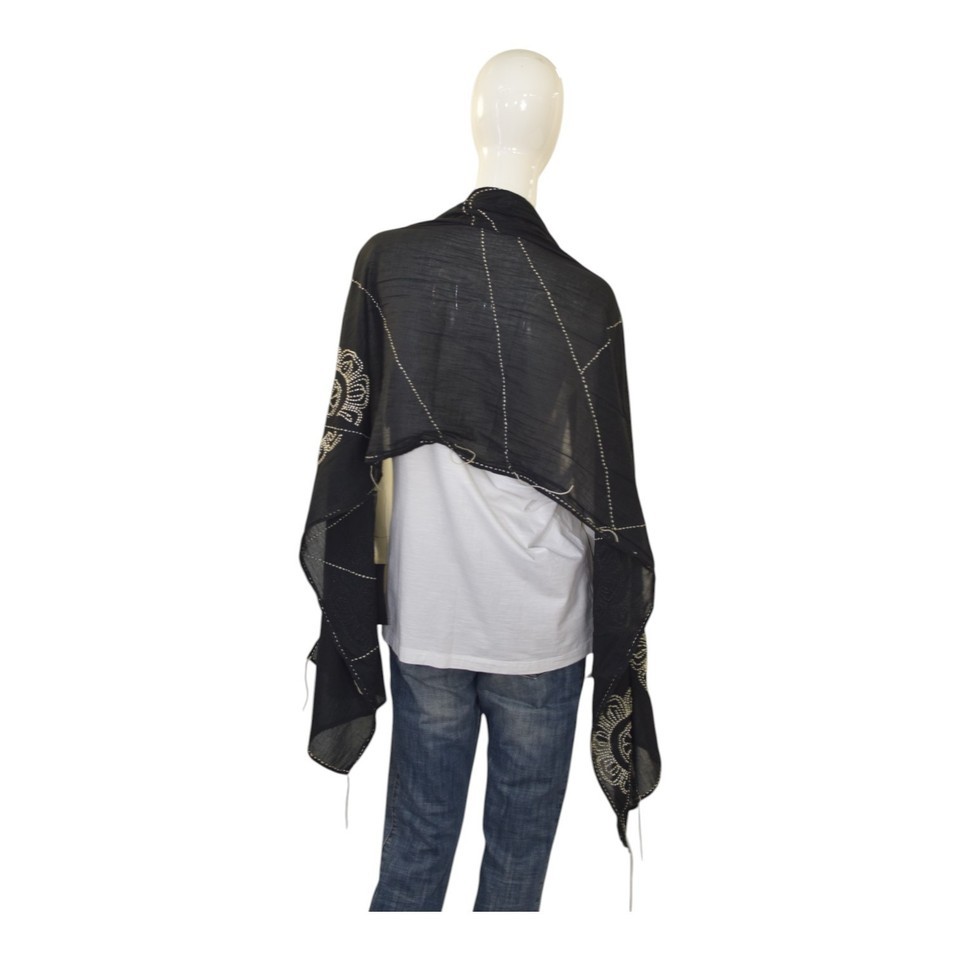 Crafted from a lightweight, soft black cotton fabric, the scarf features ornate floral motifs made from delicate white bead-style embellishments, arranged in a striking geometric pattern. The extra-long silhouette offers versatile styling options ? drape, wrap, or knot it to complement both casual and dressy looks.
