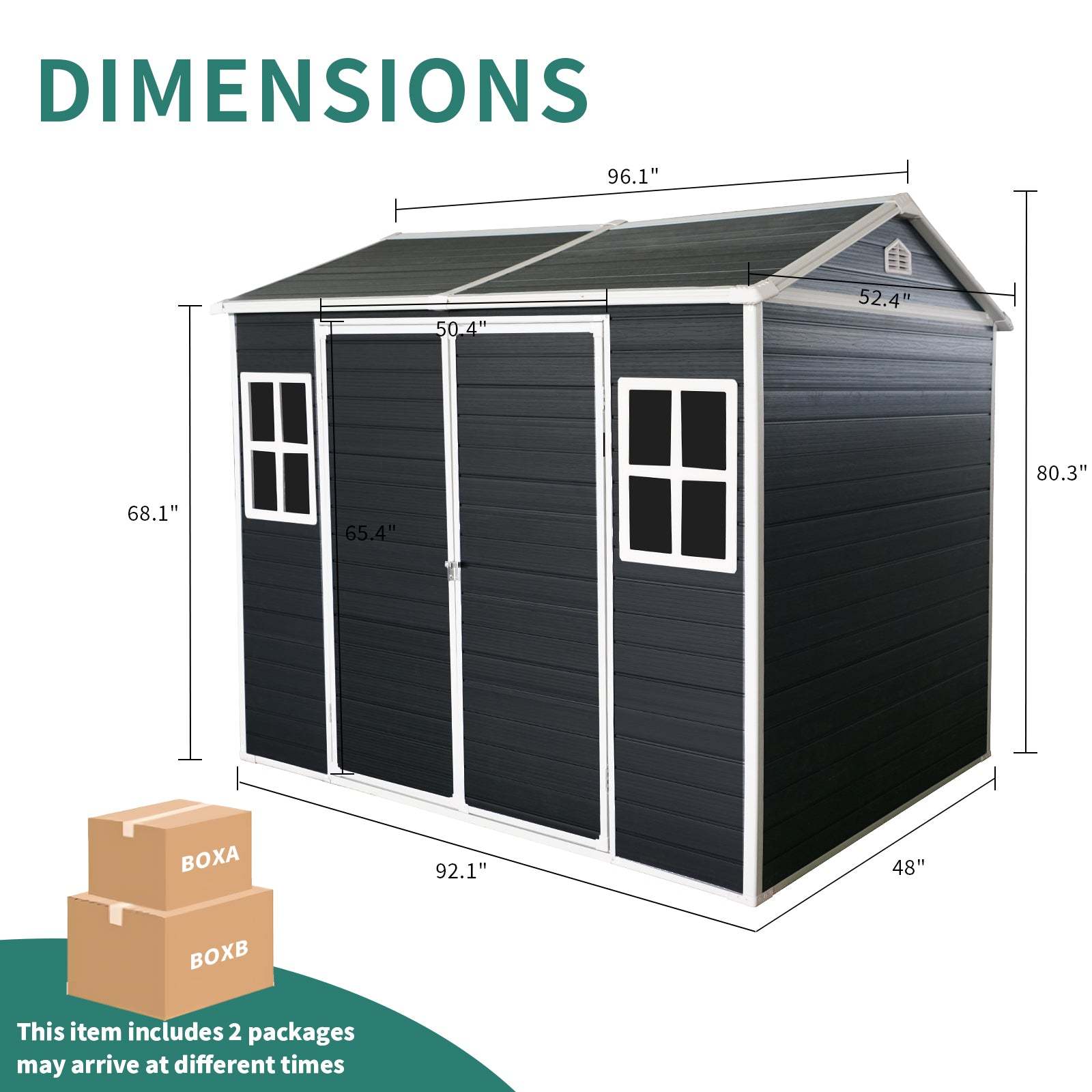 Durable Resin Shed: This 8x4ft outdoor storage shed is equipped with two windows, allowing natural light to keep the interior dry and fresh. The lockable door ensures added security, making it ideal for safely storing garden tools and equipment in your backyard or garden.