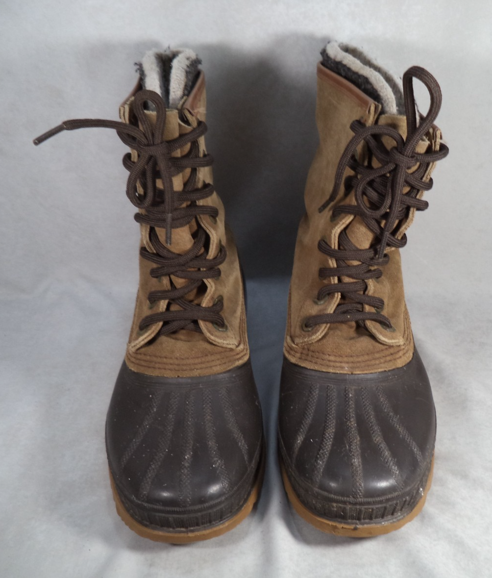 Description: The Sorel Size 8 Wool Insulated Waterproof Winter Boots are designed for both men and women, making them a versatile and practical choice for winter weather. These mid-calf snow boots feature a round toe shape, lace-up closure, and low heel height for added comfort and stability. The waterproof and insulated features make them ideal for outdoor activities in cold, snowy conditions. Made in Canada, these brown boots are lined with wool for added warmth, and the rubber outsole provides traction for safety on icy surfaces. Perfect for casual occasions, these Sorel boots are a stylish and reliable option for the winter season.