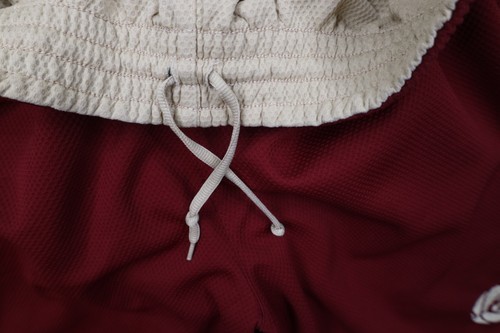 Reversible. Red side: Fabric pulls right leg. Has color fade