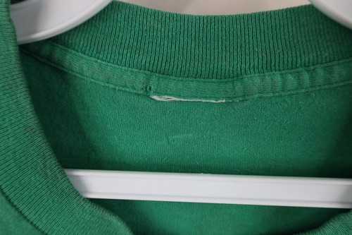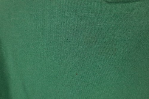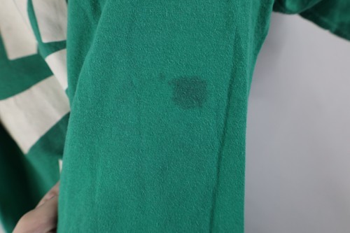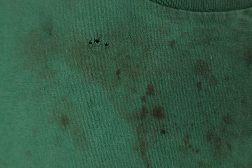 Holes front, shoulders, collar, back. Stains throughout, and collar. Collar, arms discolored. Dark spots, pilling. Graphics, color faded