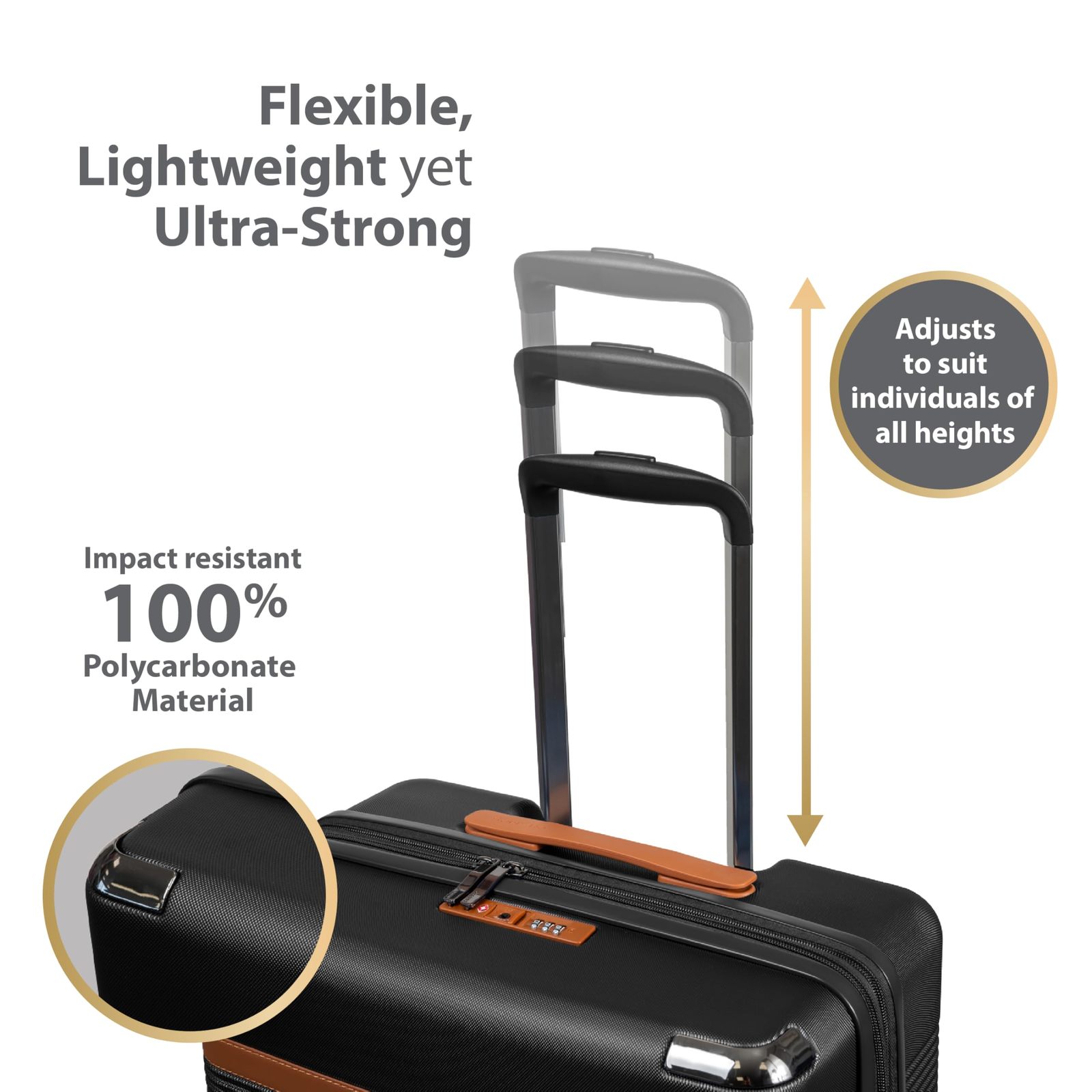 Bullet point: DURABLE, ULTRA-STRONG YET LIGHTWEIGHT HARDSIDE CONSTRUCTION - Made of premium, extra thick, lightweight, 100% polycarbonate material for extra durability and impact resistance. Each piece is put through rigorous testing to ensure it meets the highest quality standard of strength.