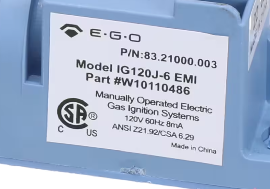 The Whirlpool 83.21000.003 / IG120J-6 EMI / W10110486 Spark Module is a genuine OEM replacement part for Whirlpool and KitchenAid gas cooktops and ranges. This spark module provides the electrical spark needed to ignite the surface burners, ensuring reliable lighting every time you cook. If your burners fail to ignite or require repeated attempts to light, replacing the spark module restores safe and consistent performance.