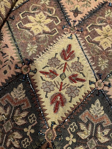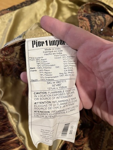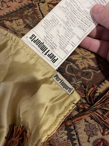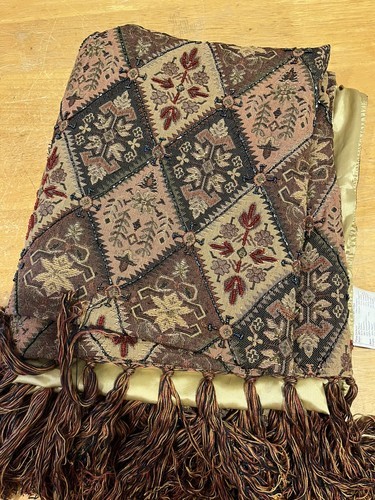 Vtg Pier 1 Beaded Boho Tapestry Throw Blanket W/ Fringe Gold Lining 50x60”