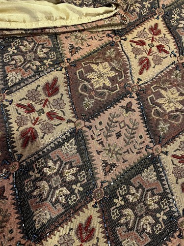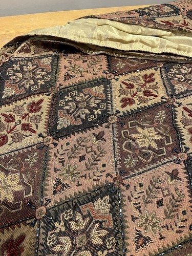 This vintage Pier 1 bed throw features a diamond pattern in a multicolor tapestry design, accented with beaded detailing and fringed edges for a boho aesthetic. Measuring 60 inches in length and 50 inches in width, this throw blanket is adorned with gold lining for an added touch of luxury. Perfect for adding a touch of warmth and style to any room, this unique piece exudes a charming and eclectic vibe that is sure to elevate your home decor.