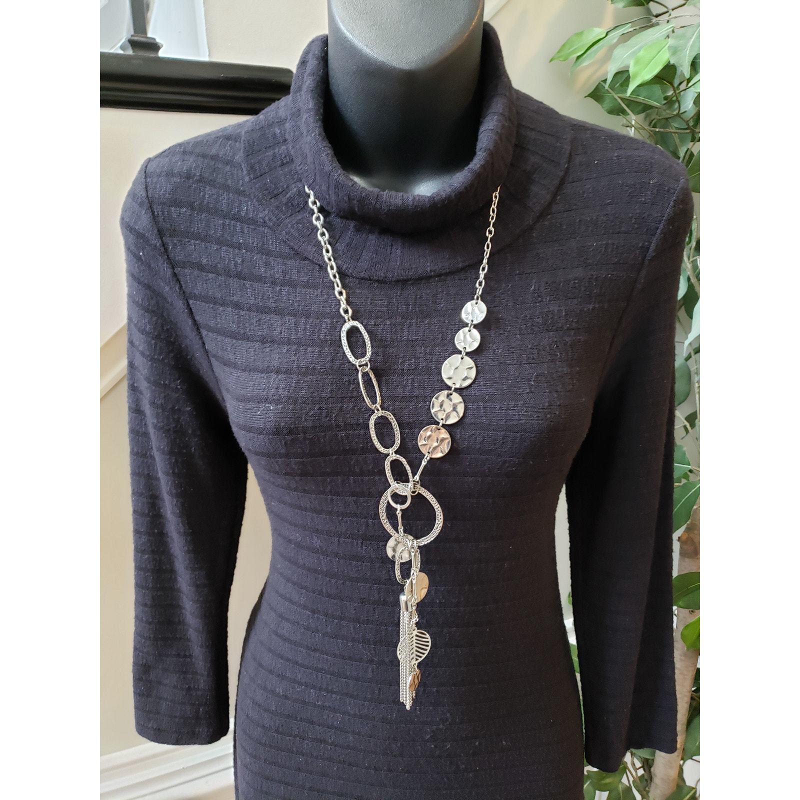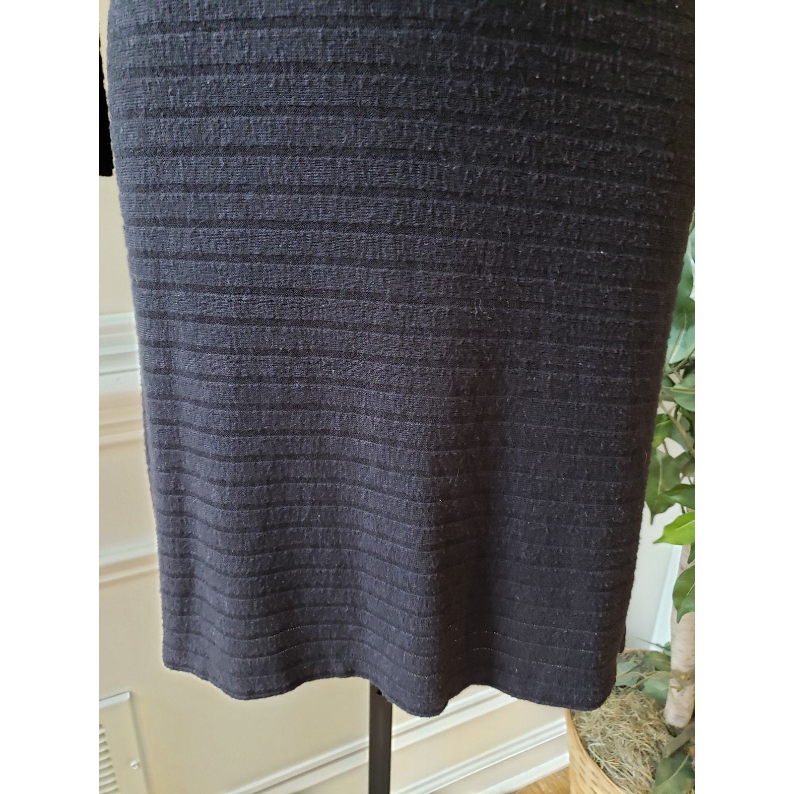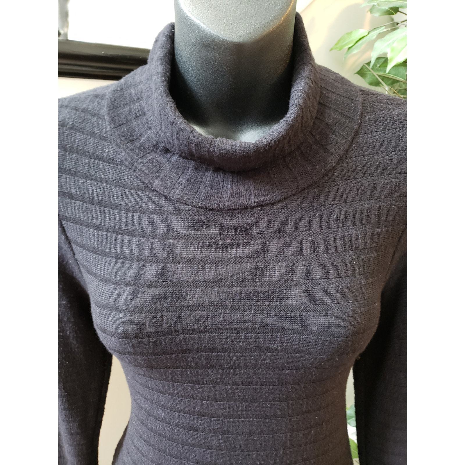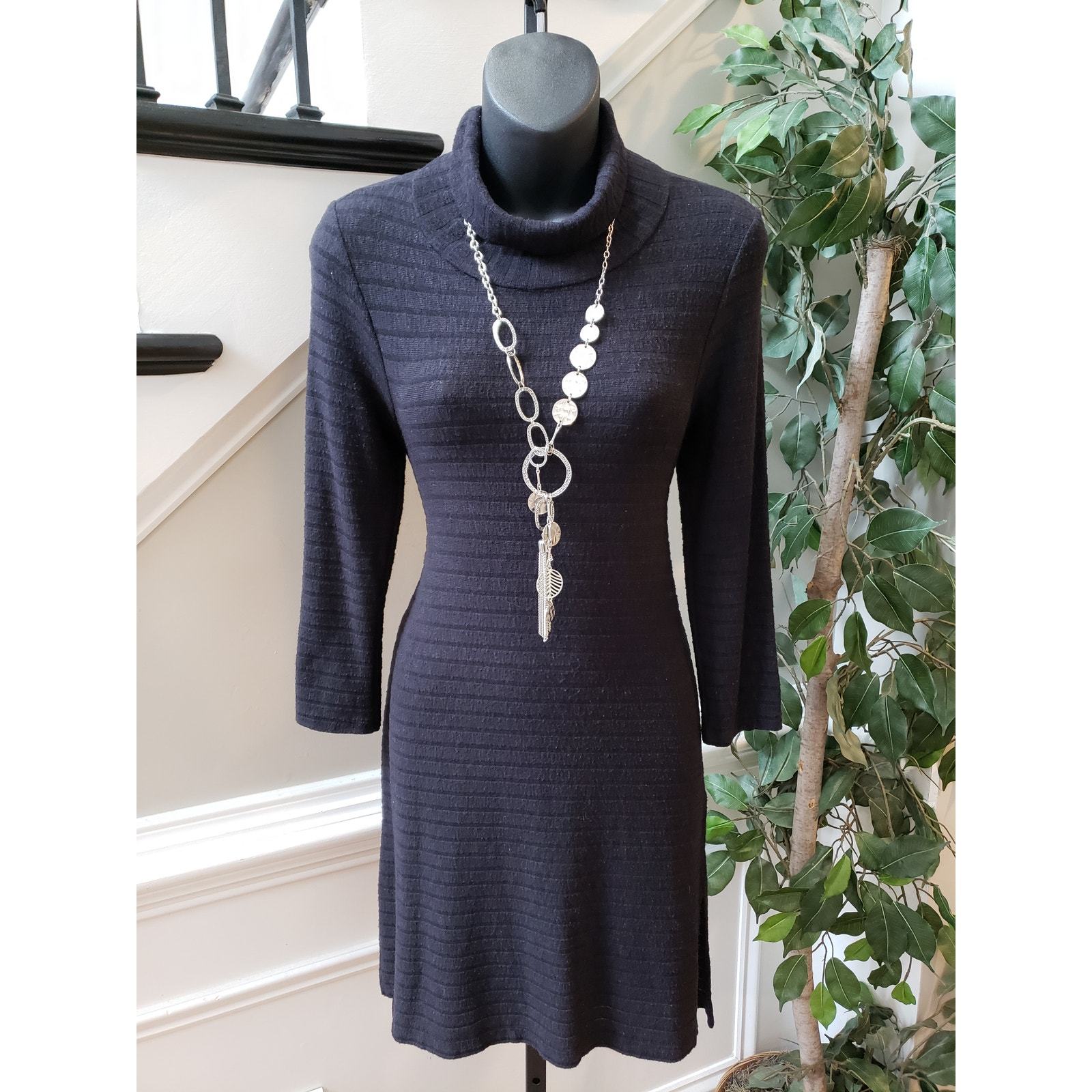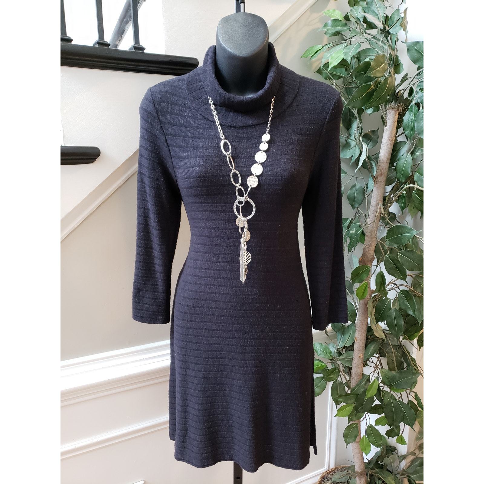 Stay cozy and chic in this black ribbed sweater dress by Puella, size Small. Crafted in the USA from a soft blend of polyester, rayon, and spandex, this dress features a flattering turtleneck, fitted silhouette, and 3/4 sleeves. Its ribbed knit texture adds subtle dimension, making it perfect for layering or wearing on its own during cooler seasons.
