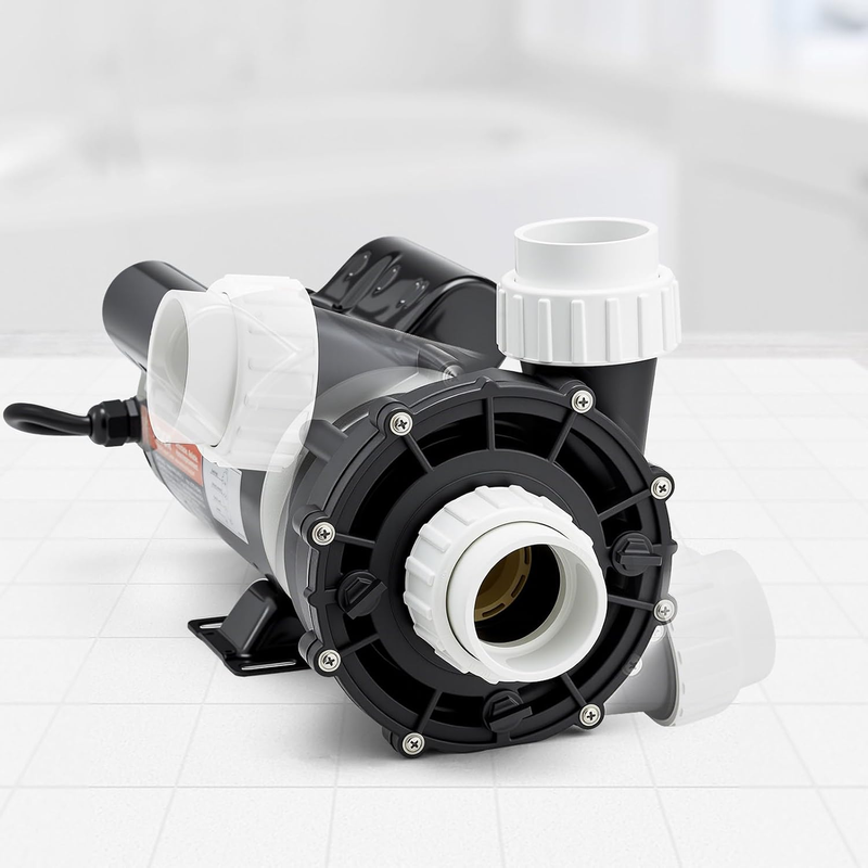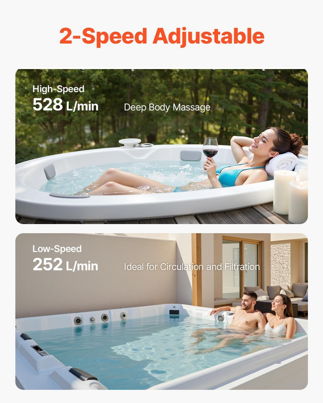 Efficient Water Circulation: Equipped with a 2 HP high-performance motor, our spa pump delivers up to 528 L/min of flow and a max head of 54.79 ft (16.7 m) at high speed. Keeps warm water moving evenly for a clean, consistent spa experience