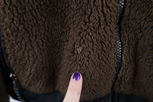 Stains front bottom, left cuff, collar. Color faded. Fleece matted