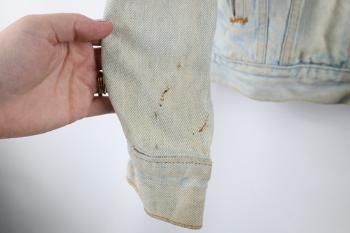 Stains front bottom, both arms, back top, inner lining. Distressed and faded all over. Color faded. USA made