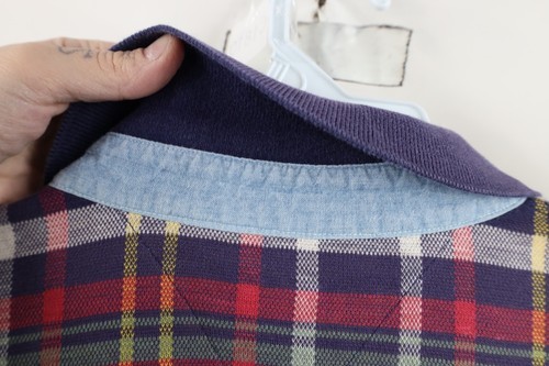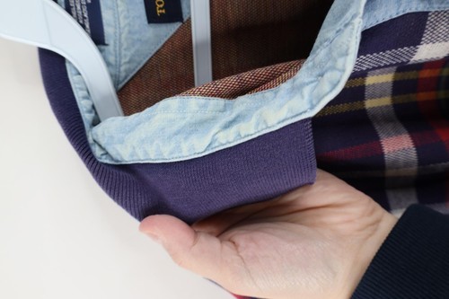 Loose threads buttons. Collar/inner collar, arms discolored. Color faded. Pilling