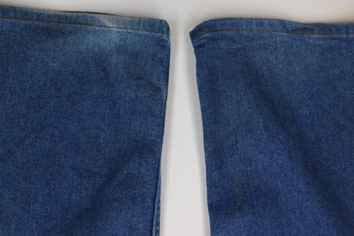 Blemishes/discolored front both legs, crotch area. Discolored throughout, cuffs, waist. Thread bare cuffs, fly, pockets, waist. Distressed and faded. Color faded. Loose threads waist. Made in USA