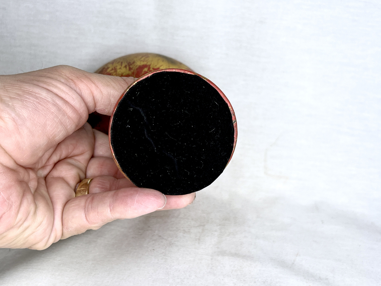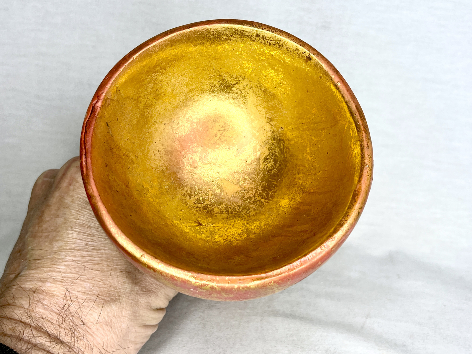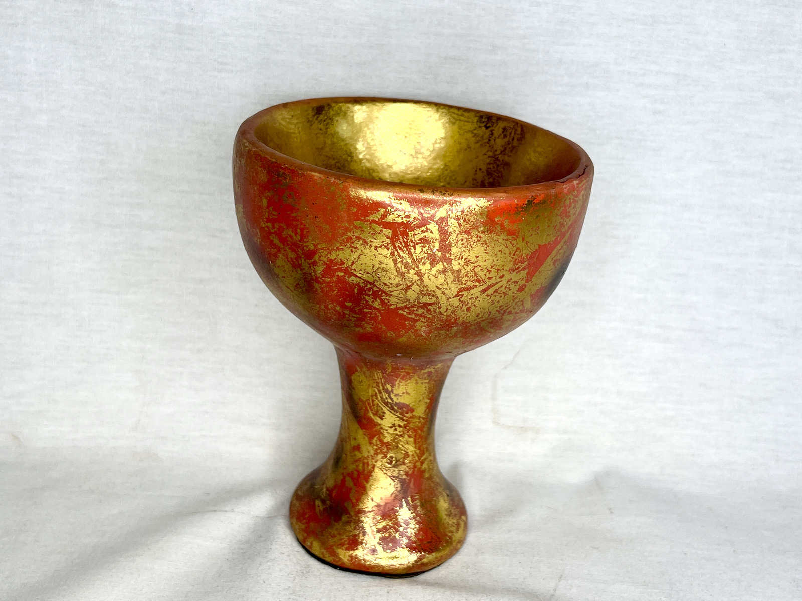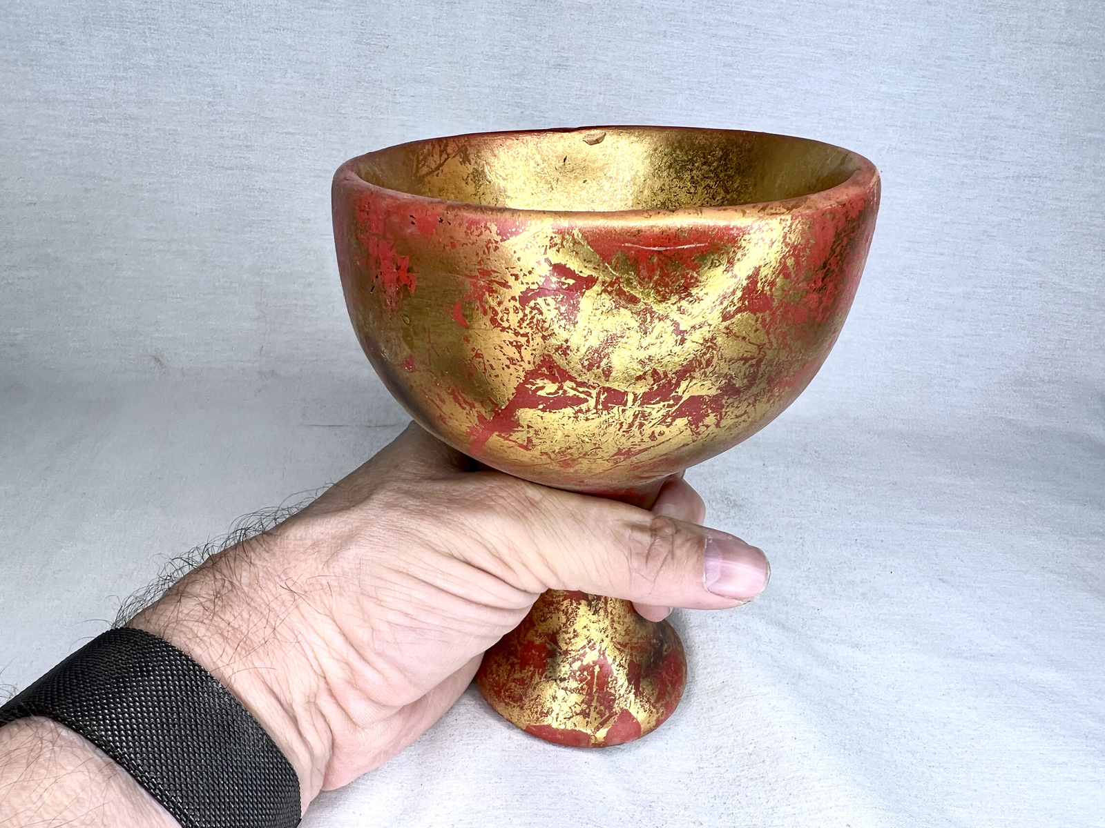 The Grail is Reddish Clay Brown with Real Gold Leafing Applied. It is made out of Solid Resin and is Very Durable. The Indiana Jones Grail measures 6 inches tall by 5 inches in diameter at the upper drinking cup lip.