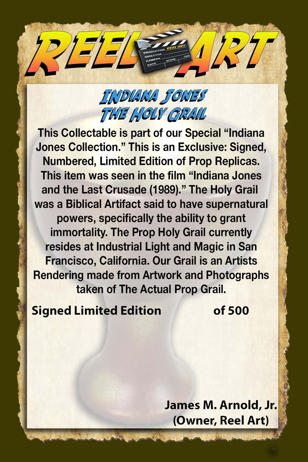 This Collectable is part of our Special "Indiana Jones Collection." This is an Exclusive: Signed, Numbered, Limited Edition of Real Prop Replicas. This item is a Very Detailed Prop Replica of the Famous Holy Grail Chalice as it was seen in the hit film: "Indiana Jones and the Last Crusade (1989)" Starring: Harrison Ford and Sean Connery. This Grail is an Artists Rendering made Directly from various Drawings, Pictures and Specifications of the Real Prop Grail Chalice. Each item Comes Complete with a Double Sided, 4 x 6 inch, Full Color, Professionally Printed, Certification Card. This Documentation contains Poster Art and Explains in Detail about the Grail Chalice and how it was used in the film. Grail comes Brand New in Box Ready for your next Adventure!