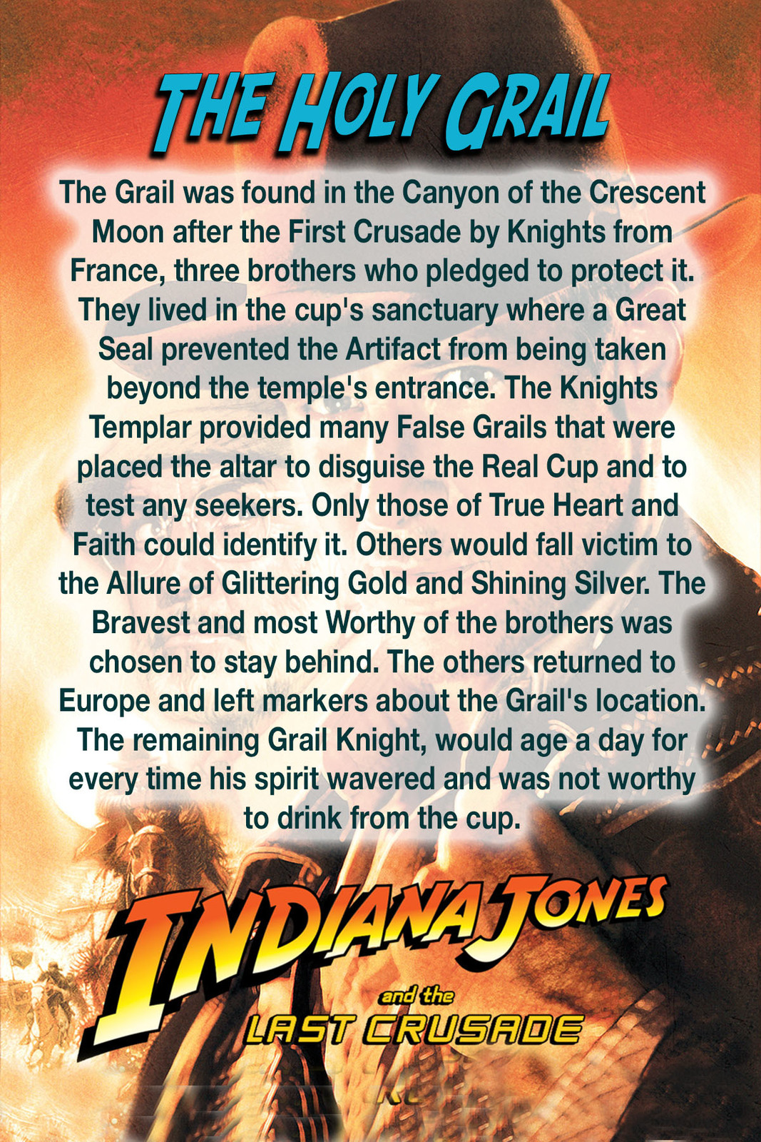 The Intrepid Explorer Indiana Jones sets out to rescue his father, a Medievalist who has vanished while searching for the Holy Grail. Following clues in the Old Man's Notebook, Indy arrives in Venice, where he enlists the help of a Beautiful Academic, but they are not the only ones who are on the Trail, and some Sinister Old Enemies soon come out of the Woodwork.