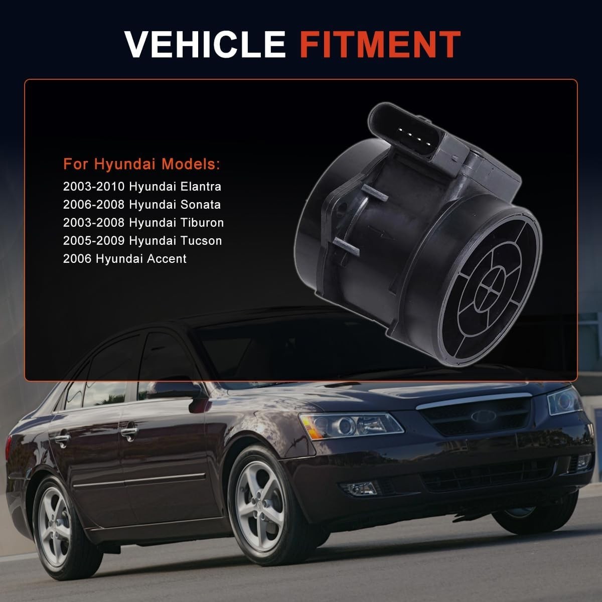 Vehicle Fitment: Compatible with 2003-2010 Hyundai Elantra, 2006-2008 Hyundai Sonata 2.4L, 2003-2008 Hyundai Tiburon 2.0L, 2005-2009 Hyundai Tucson 2.0L, 2006 Hyundai Accent Replace Part Numbers: 2816423700, 28164-23700, 28164-23720, 2816423720, 28164-25000, 2816425000, 5WK96431, MAS0255, 74-10114, 7410114, 2451091, 5S2982, 1580704 Main Functionality: Accurately measures airflow compatible with improved fuel efficiency and lower emissions Installation Attention: The air box should be neat and tidy. Clear the error code and ensure that the ECU is closed. Unplug the harness connector before installing the air flow meter Note: Please confirm the OE number before purchasing, OR Enter Vehicle Type + Year + Make + Model + Trim + Body Style + Engine on top compatibility
