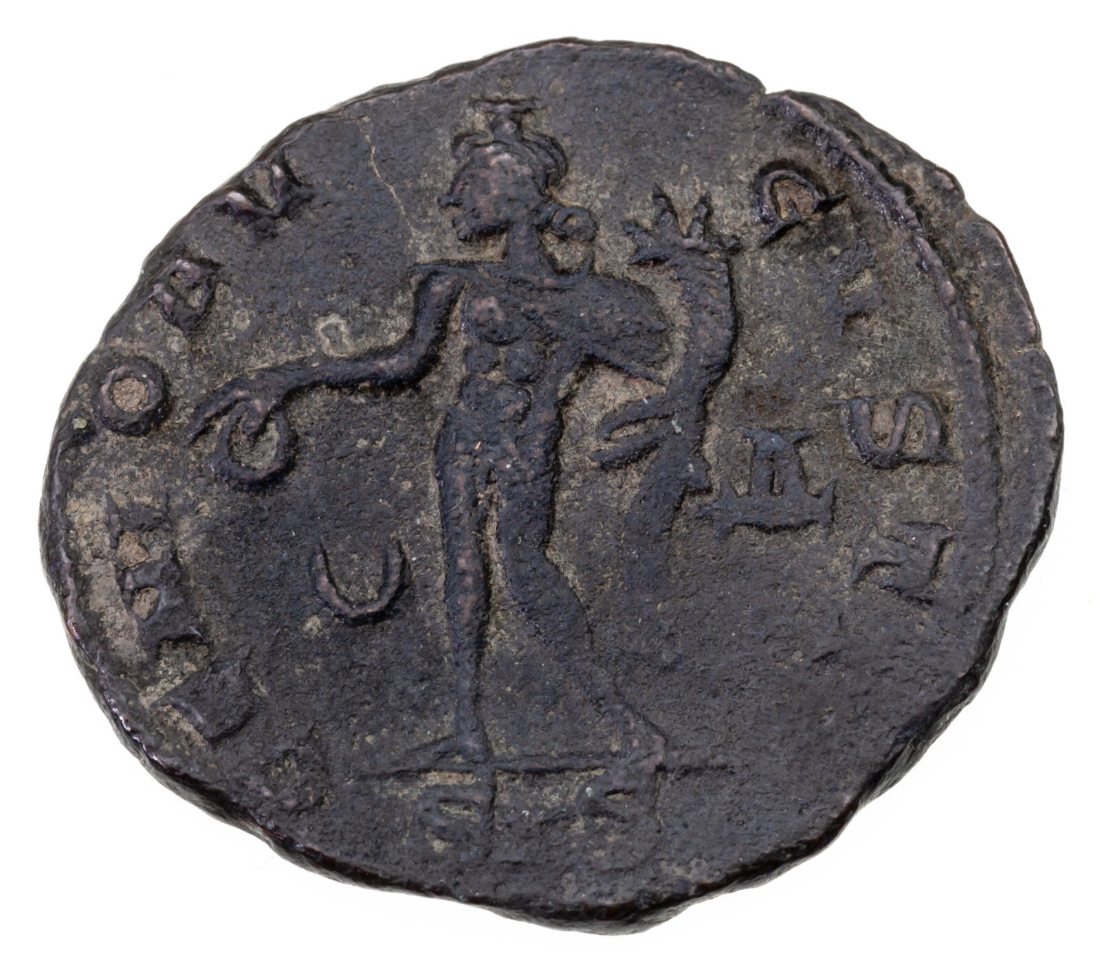 L'inverse represente le genie debout a gauche en tenant la patera et la corne d'abondance avec la lettre A sur le champ droit et la soeur ci-dessous