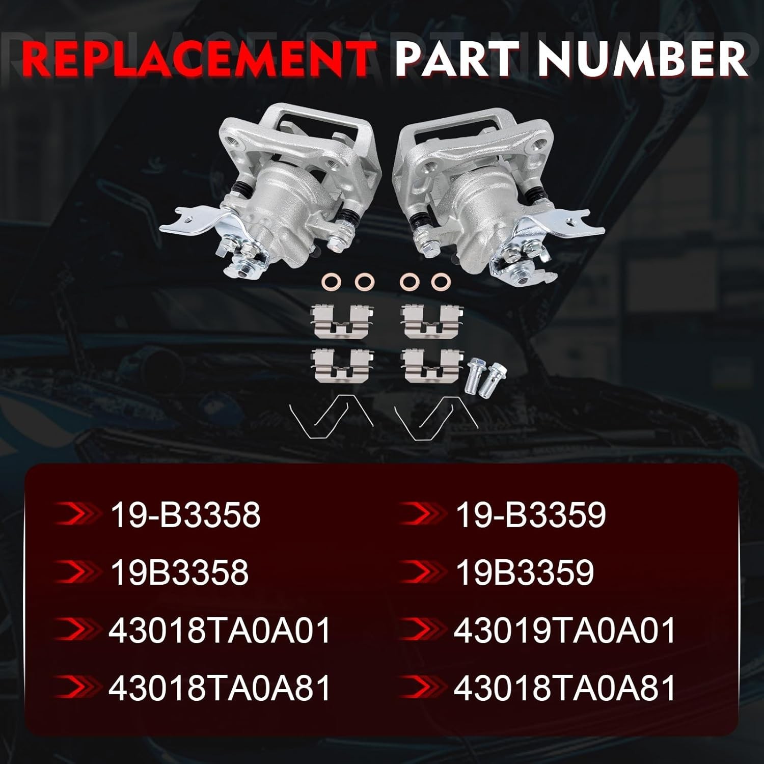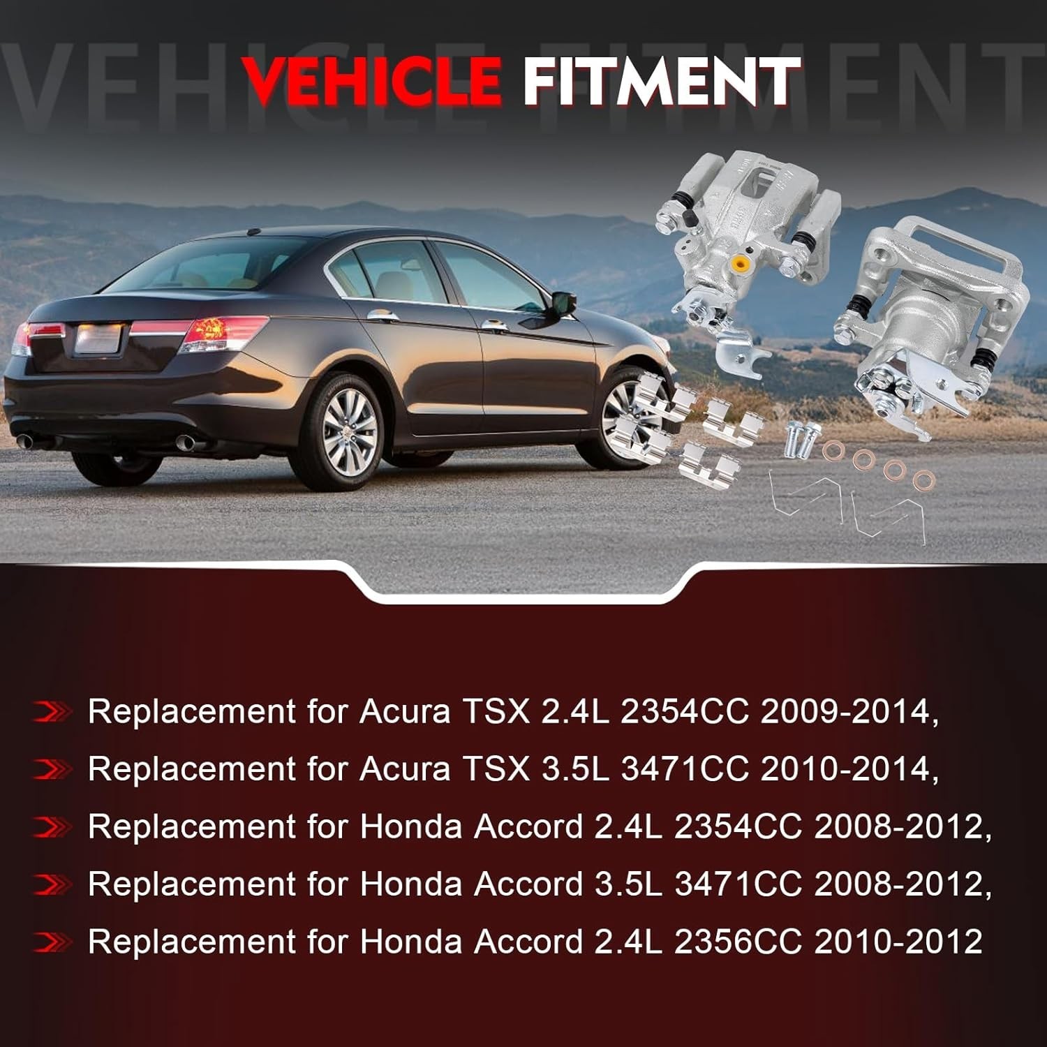Replaces OEM Part Number: The Rear Disc Brake Caliper Assembly with Bracket Replaces 19-B3358, 19B3358, 43018TA0A01, 43018TA0A81, 19-B3359, 19B3359, 43019TA0A01, 43018TA0A81 Compatible Models: This Rear Disc Brake Caliper Assembly Replacement for Acura TSX 2.4L 2354CC 2009-2014, Replacement for Acura TSX 3.5L 3471CC 2010-2014, Replacement for Honda Accord 2.4L 2354CC 2008-2012, Replacement for Honda Accord 3.5L 3471CC 2008-2012, Replacement for Honda Accord 2.4L 2356CC 2010-2012. NOTE: For 2008 - 2011 Accord, it only fits EX, EX-L Models; For 2012 Accord, it only fit EX, EX-L, HFP Models Premium Material: This Rear Disc Brake Caliper Assembly with Bracket is made of premium materials, corrosion-resistant and wear-resistant, can withstand extreme operating conditions such as extreme temperatures, humidity, and vibration. It's thoroughly tested to ensure performance and lasting quality High Performance: Brake Caliper is one of the core components of the disc brake system. It achieves deceleration or parking by clamping the brake pads and rubbing against the brake disc. If the caliper is damaged (such as piston stuck, oil leakage), it will cause brake drag, unilateral brake failure or reduced braking efficiency, and needs to be replaced in time Buy with Confidence: Before purchasing the Rear Disc Brake Caliper Assembly, we strongly recommend verifying your OE number and specific model to ensure a fit. Should you have any questions or require assistance, we are readily available to provide you timely service and support. Sincerely hope you have a happy life!