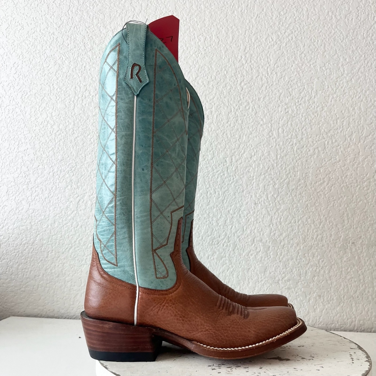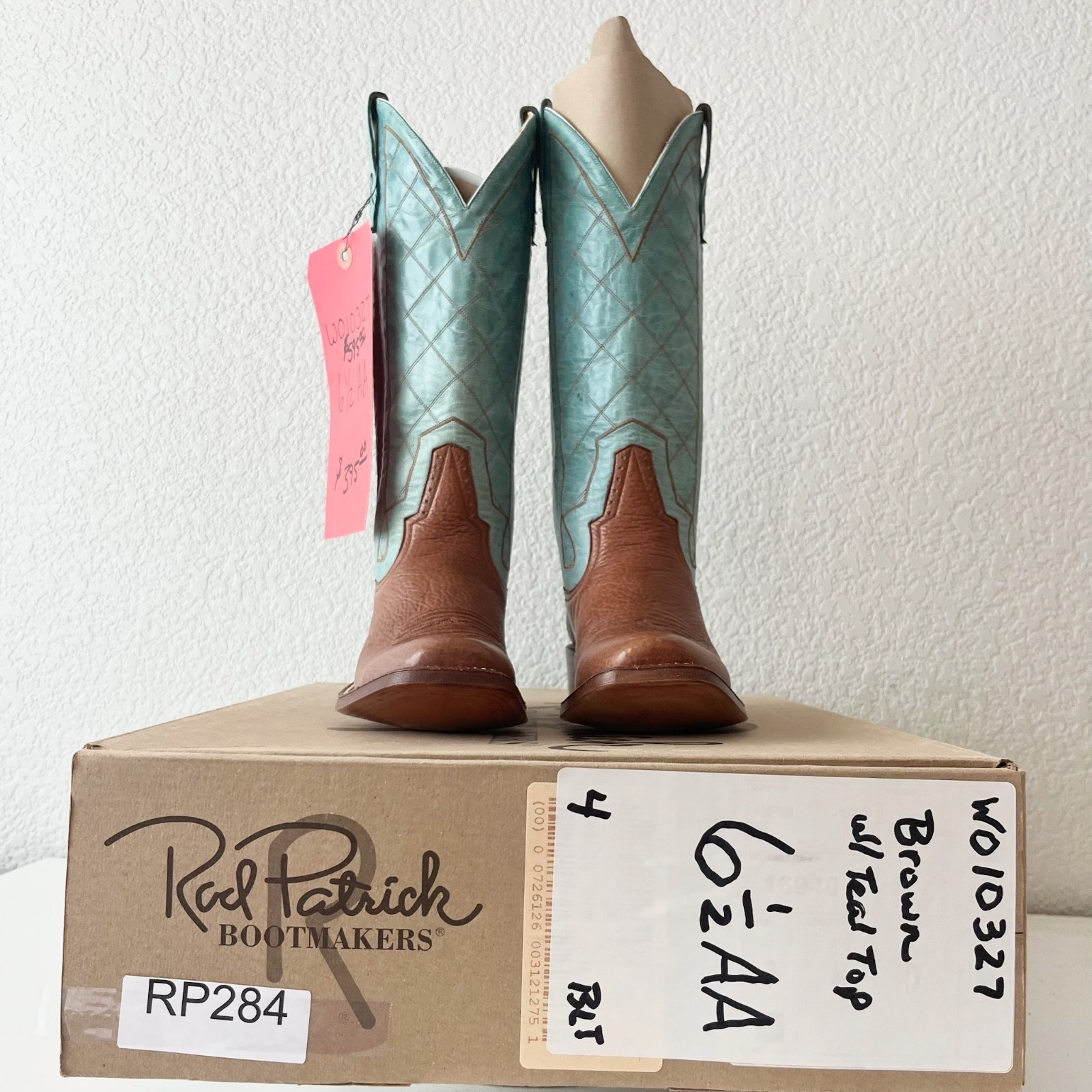 Rod Patrick Custom Bootmakers - Women's Brown Leather Cowboy Boots with a Turquoise Top, a Western Blunt Toe, a 13" Mid Calf Tall Shaft, and Leather Soles.