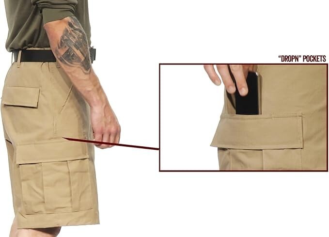 All the features of the classic BDU style shorts with a 10 inch inseam. YKK zipper fly and adjustable waist tabs. Easy access Drop pockets behind each cargo pocket. 2-front slash pockets. 2-bellowed side cargo pockets. 2-rear inserted pockets with snag proof pocket flaps.