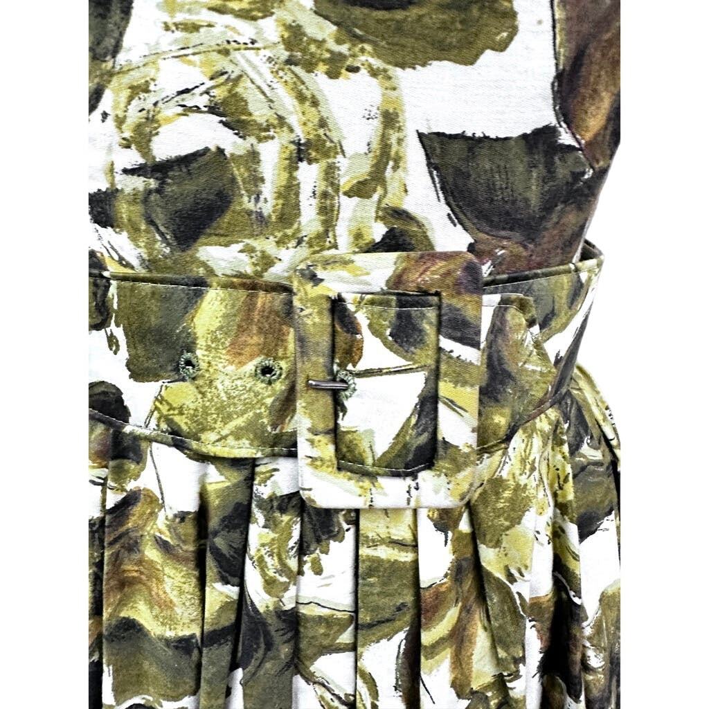 Vintage 1950s Miss R cotton dress, a gorgeous example of midcentury femininity with a cream and green floral print, pleated full skirt, and the original matching belt. Perfect for collectors and lovers of rockabilly and retro style.