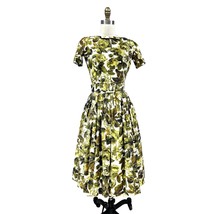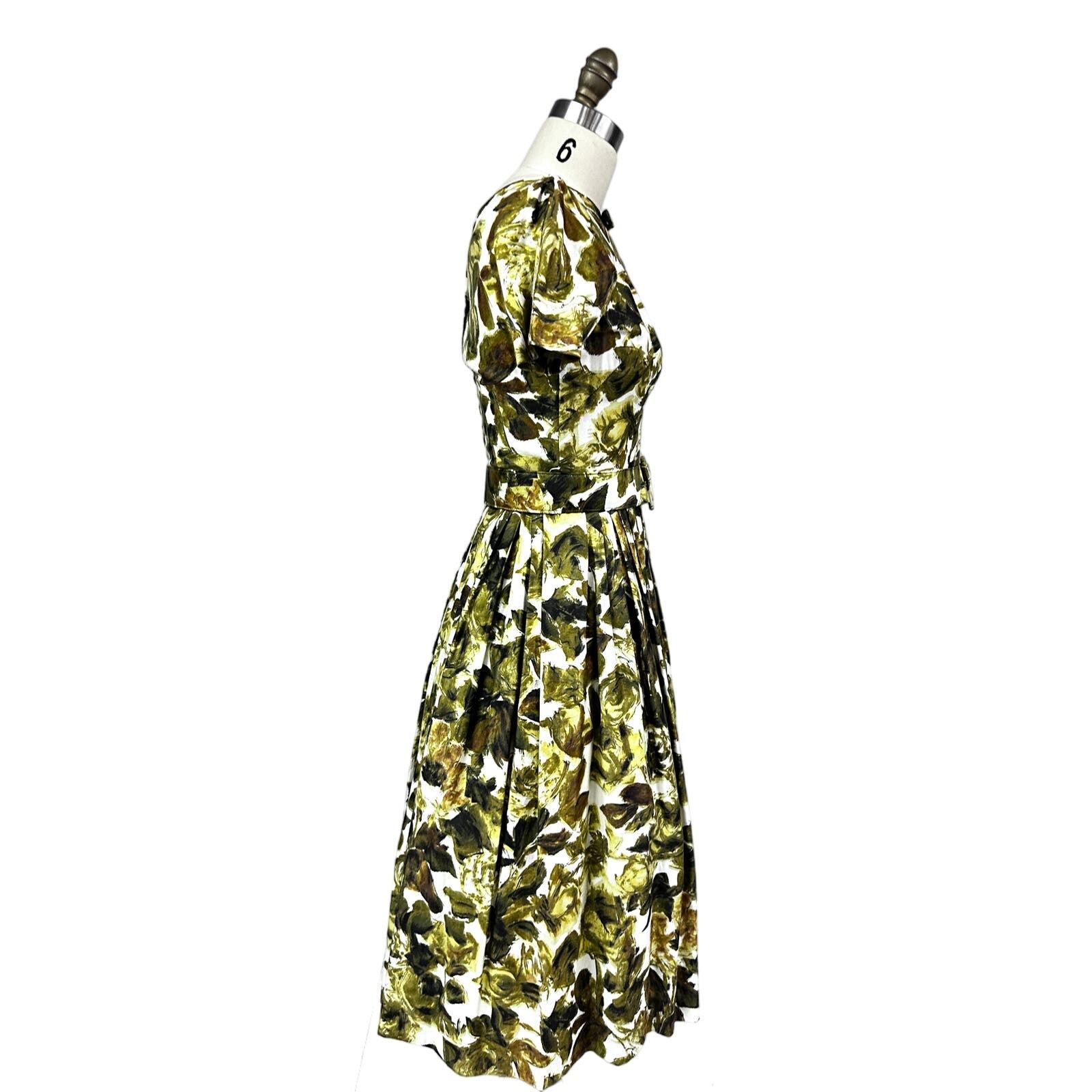 Miss R VTG 1950s Cotton Dress Cream Green Floral Full Skirt Belt Rockabilly S