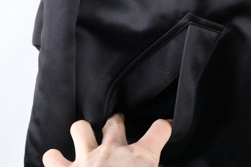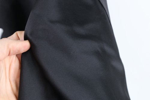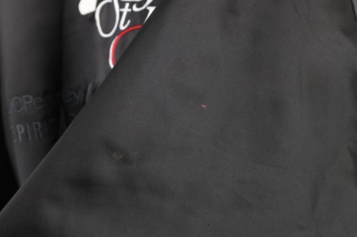 Has stains on front right, back, and right arm and hole on left arm cuff
