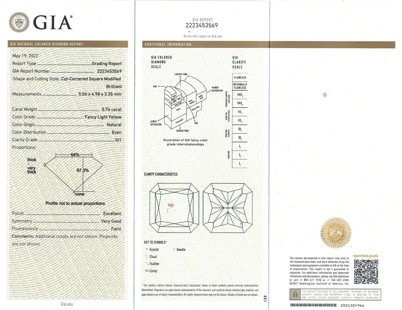 E un modo perfetto per dire - Ti amo - con questo splendido anello di diamanti! Questo anello di coinvolgimento del design art deco mostra un diamante da 0,76 Carat Gia radiante brillante a taglio naturale a fantasia giallo giallo chiaro abbracciato da due lati di diamanti tagli al cuscino giallo chiaro naturale. I diamanti incolori e gialli rotondi aggiuntivi allineano il doppio aono e il gambo diviso aggiungendo un'ulteriore eleganza all'anello. Realizzato a mano in oro a due carati da 18 carati. Il peso totale dei carati e di 2,02 carati. I nostri prodotti sono tutti realizzati a mano con qualita e cura, nel cuore del Diamond District in 47th Street a New York City. La nostra dedizione e impegno per il lavoro e la qualita eccezionali superano tutti gli altri. Poiche tutti i nostri prodo