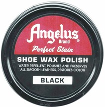 FOR SALE IS ONE (1) NEW ANGELUS BRAND BLACK color PERFECT STAIN SHOE WAX POLISH 3 fluid ounce IN SNAP OPEN ROUND METAL TIN MANUFACTURED BY ANGELUS SHOE POLISH COMPANY MPN 400-03-001 UPC# 086366400012. THIS IS A CLASSIC PASTE IN METAL CAN FORMULATION, ANGELUS BRAND PERFECT STAIN SHOE WAX POLISH STILL USES THE ORIGINAL FORMULA CREATED IN 1907 BY THE FOUNDERS (see picture of the founders). THIS IS THE FLAGSHIP PRODUCT OF ANGELUS SHOE POLISH COMPANY FOR OVER ONE HUNDRED YEARS, THIS IS WHERE IT ALL BEGAN FOR ANGELUS SHOE POLISH COMPANY. ANGELUS BRAND PERFECT STAIN SHOE WAX POLISH IN THIS CONVENIENT 3 fluid ounce SNAP OPEN METAL CAN IS A PASTE BLEND OF PURE CARNUBA WAX, BEESWAX AND THE VERY FINEST GRADE OF OTHER WAXES AND OILS. THIS PRODUCT IS FAR PREMIUM TO KIWI BRAND SHOE POLISH, WORKS BETTER AND LASTS LONGER. ANGELUS BRAND SHOE WAX POLISH DOES MORE THAN JUST POLISH. IT CLEANS, PRESERVES, WATERPROOFS AND RESTORES A RICHER COLOR TO FADED FOOTWEAR, SHOES, BOOTS AND LEATHER GEAR. CARNUBA WAX, A WELL ESTABLISHED PRODUCT FOR THE AUTO AND FURNITURE POLISH INDUSTRY HAS BEEN RECOGNIZED FOR YEARS AS AN EXCELLENT PRESERVER FOR LEATHER. WORKS GREAT ON SHOES OR BOOTS THAT MAY HAVE FADED OR DRIED OUT OVER TIME. CAN BE APPLIED BY OLD TEE SHIRT, COTTON TOWEL OR 100% COTTON DIAPER FOR BEST RESULTS. GREAT FOR ALL SMOOTH LEATHERS. GENUINE ANGELUS BRAND SHOE WAX POLISH WILL HELP KEEP YOUR LEATHER SOFT, SUPPLE AND CONDITIONED. YOUR LEATHER DOES NOT BECOME SLICK, MAKING THIS A GREAT OPTION FOR USE ON SHOES, BOOTS, HANDBAGS, SADDLERY, LEATHER BOUND BOOKS, JACKETS, UPHOLSTERY HOLSTER, ETC. GENUINE ANGELUS QUALITY, USA MADE IN SANTE FE SPRINGS, CALIFORNIA, USA. ANGELUS LEATHER CARE PRODUCTS HAVE BEEN USED FOR OVER ONE HUNDRED YEARS (since 1907) ON SADDLES, BOOTS, SHOES, LUGGAGE, UPHOLSTERY, ETC. YOU WILL RECEIVE ONE (1) ROUND METAL TIN OF GENUINE ANGELUS BRAND BLACK COLOR SHOE WAX POLISH SHIPPED BY USPS.....