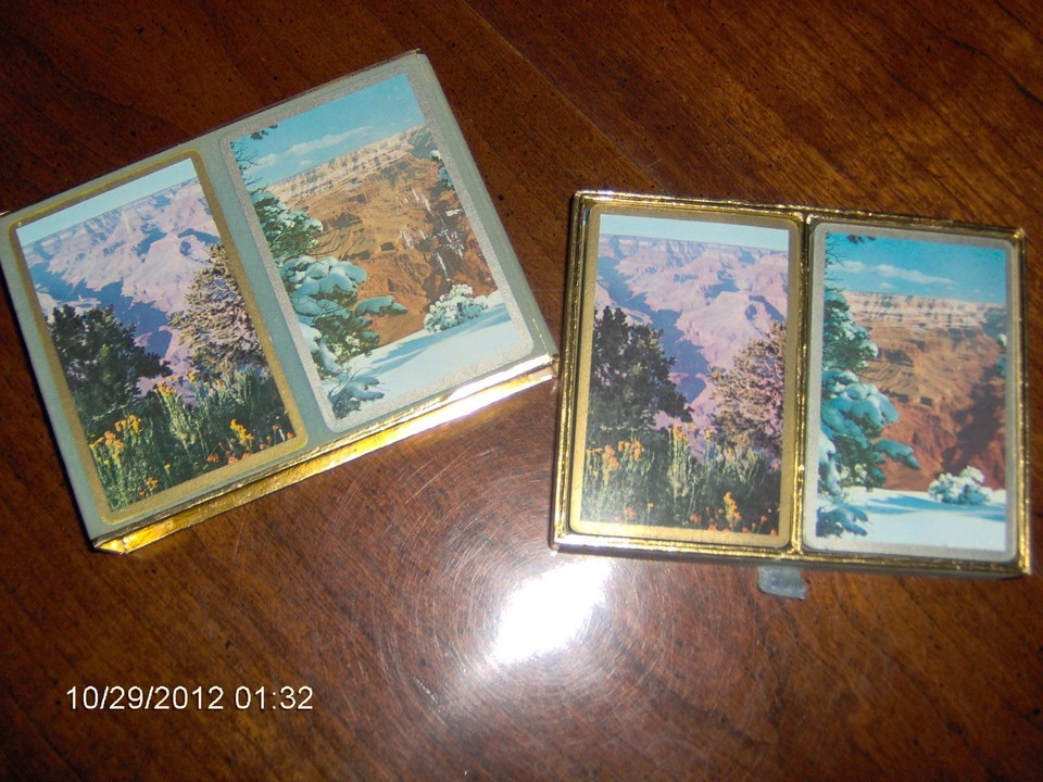 FOR SALE IS THIS TWO-DECK SET OF VINTAGE USED CONGRESS 606 PLAYING CARDS WITH CELL-U-TONE FINISH GRAND CANYON THEME. MADE BY THE U.S. PLAYING CARD CO., CINCINATTI, USA. THESE CARDS COME IN A VELOUR CARDBOARD BOX (w/gold foil congress sticker on bottom) WITH SHINY GOLD PULL OUT DOUBLE DECK TRAY, 52 CARDS IN EACH OF TWO DECKS WITH NO JOKERS, "606" AND "Z 2660" ON THE ACES INDICATING MODEL AND DATE CODE. THE "Z" INDICATES THESE WERE MANUFACTURED IN 1919, 1939, 1959 OR 1979, LIKELY 1959. ONE DECK DISPLAYS A GOLD FRAMED SUMMER SCENE (picture/left) AND THE OTHER A SILVER FRAMED SNOW SCENE (picture/right). THESE CARDS ARE USED BUT IN GREAT CONDITION. THE OUTER VELOUR BOX HAS SIGNS OF NORMAL WEAR BUT OVERALL AN ATTRACTIVE AND READY TO PLAY DECK. YOU WILL RECEIVE THIS TWO-DECK SET OF GRAND CANYON THEMED VINTAGE CONGRESS PLAYING CARDS (52 cards per deck/no jokers) SHIPPED FAST BY USPS FIRST CLASS MAIL.....