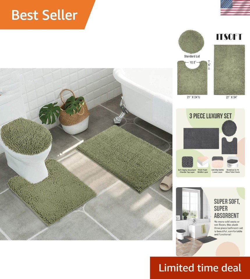 Elegant 3-Piece Sage Green Chenille Bathroom Rugs - Non-Slip & Machine Washable