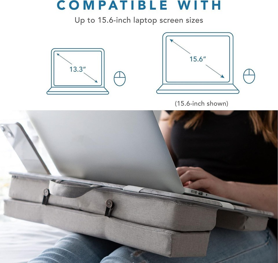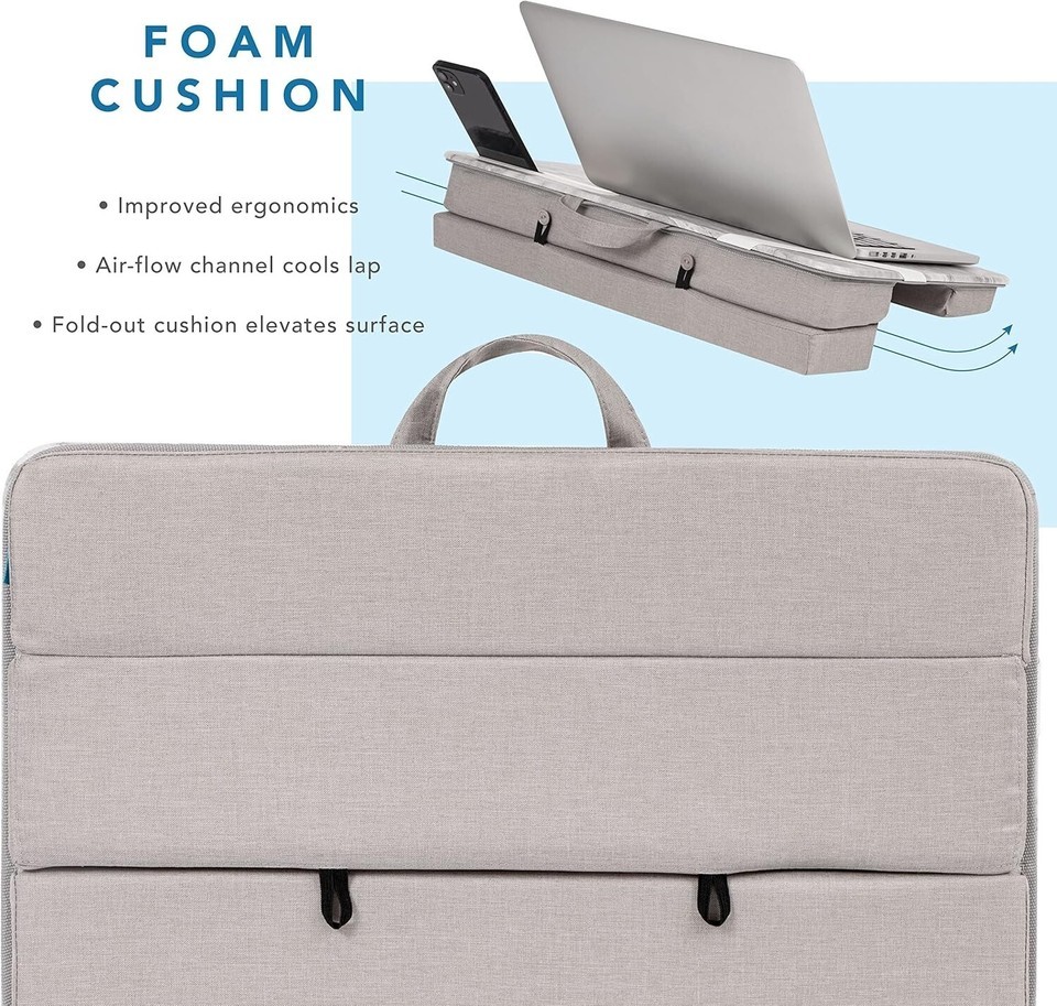 Features: Portable,Smooth surface,Proper airflow,Adjustable cushion,Neck strain prevention,Foam-filled cushion,Comfortable fabric cover,Center airflow channel,Integrated device ledge,Built-in phone slot,Built-in carry handle