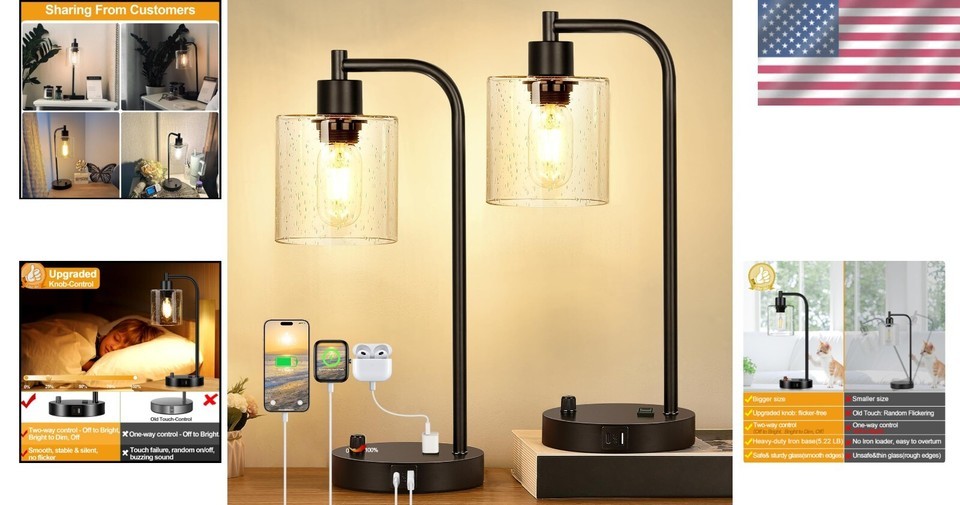 Dimmable Industrial Desk Lamps Set with 2 USB Ports & Energy-Efficient LED Bulbs