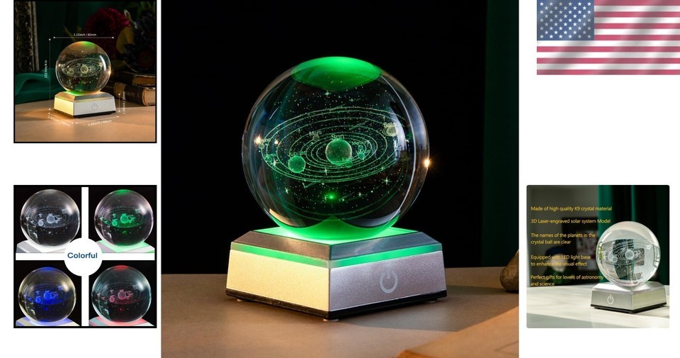 Laser Engraved Planetarium Crystal Ball with Multicolor LED Base - Space Decor