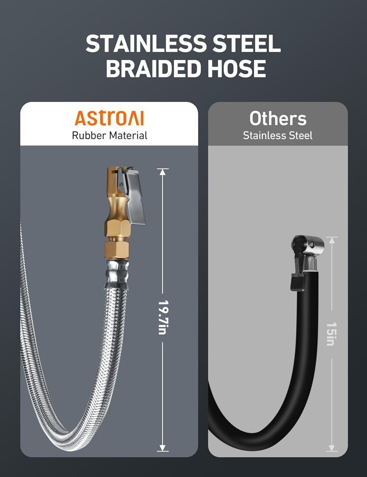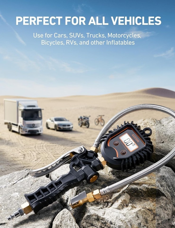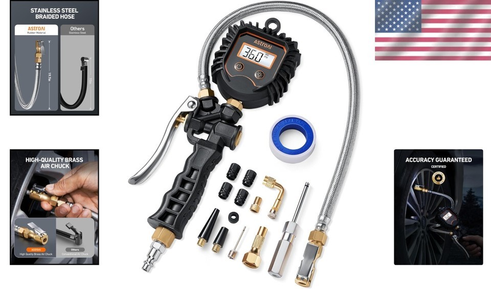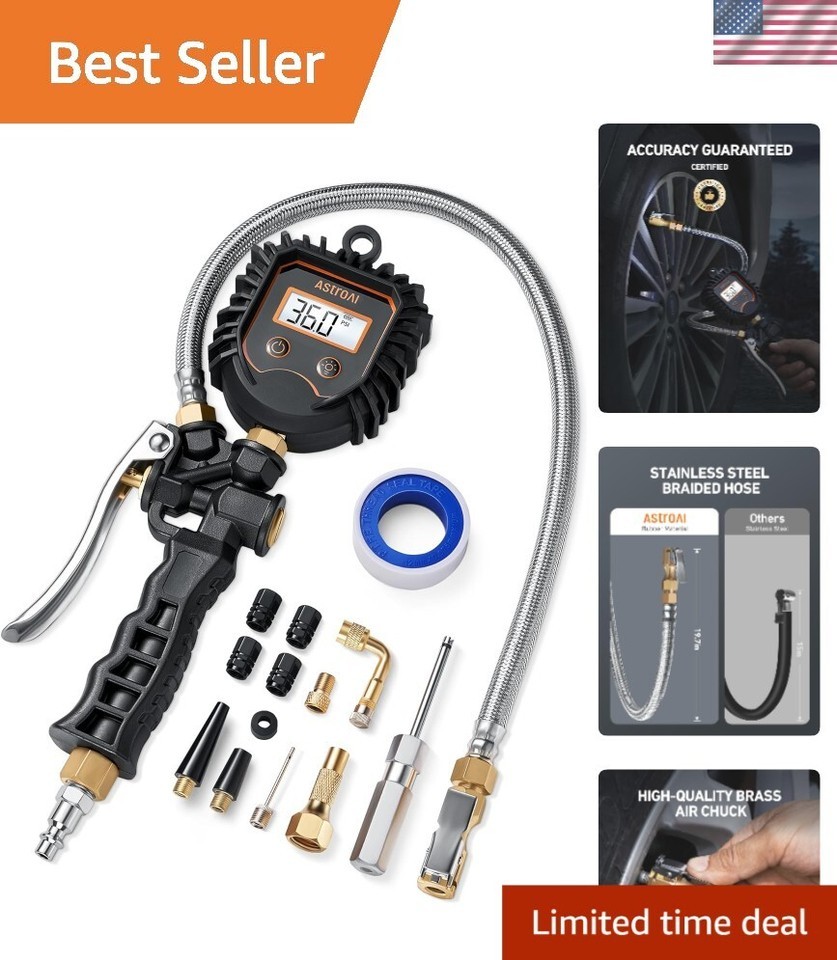 Heavy-Duty Tire Inflator Gauge with Stainless Braided Hose for All Vehicles