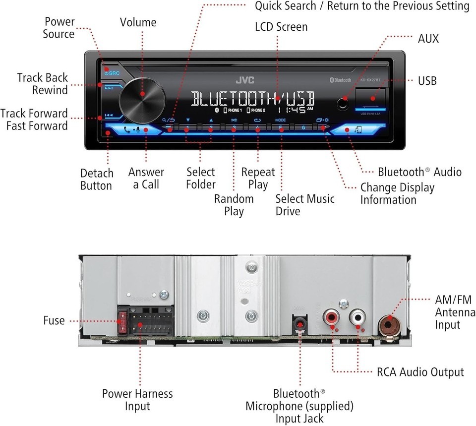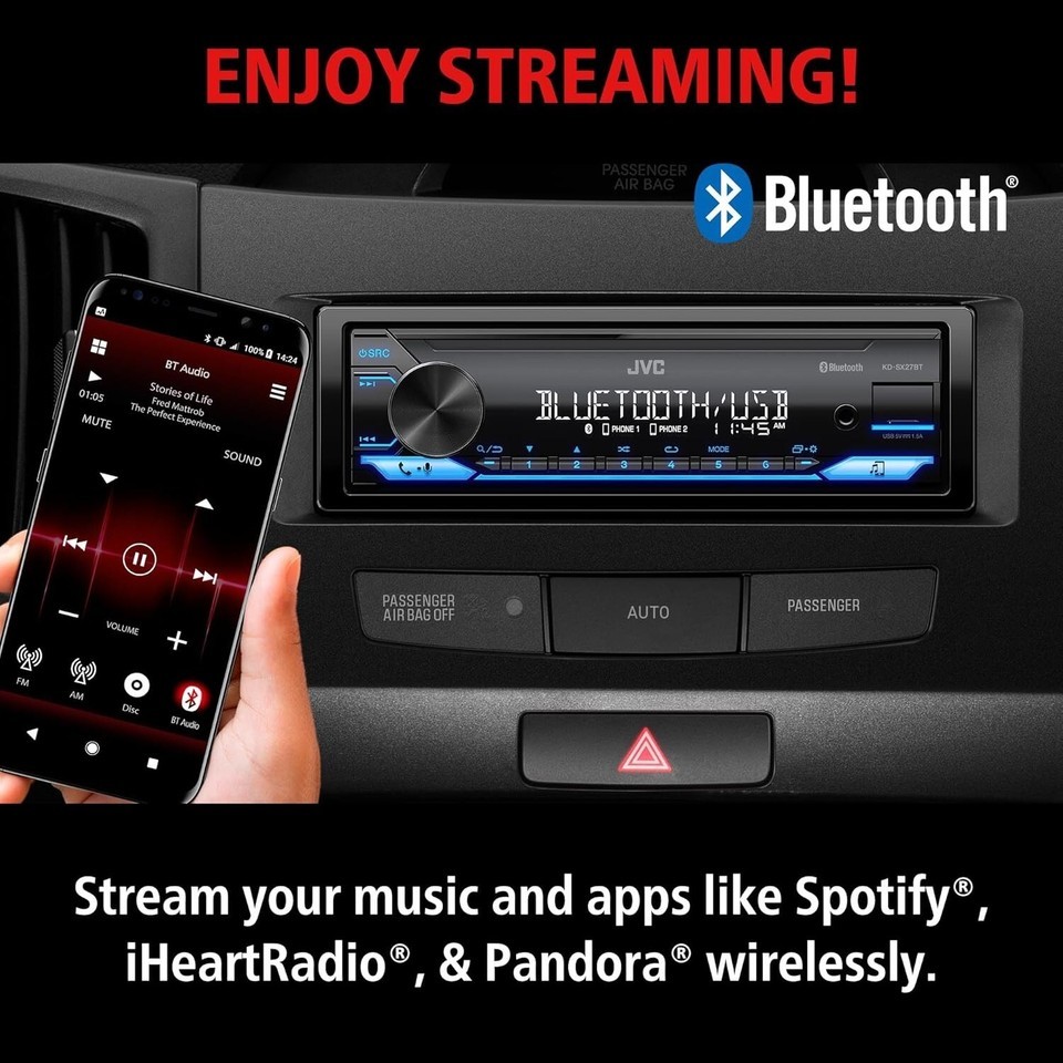 Features: Bluetooth,AM/FM Radio,AUX Input,USB Charging,Remote App Control,Hands-free Calling,13-band Equalizer,K2 Technology,Time Alignment,Sound Lift,Fast Charging,Preamp Output,Bluetooth Streaming,AM/FM Tuner,USB 1.5A Charging Port,Control through JVC Remote App,Short Chassis Design,Supports MP3 Playback,Supports WMA Playback,Supports WAV Playback,Supports AAC Playback,Supports FLAC Playback,Connect 2 Phones Full-Time