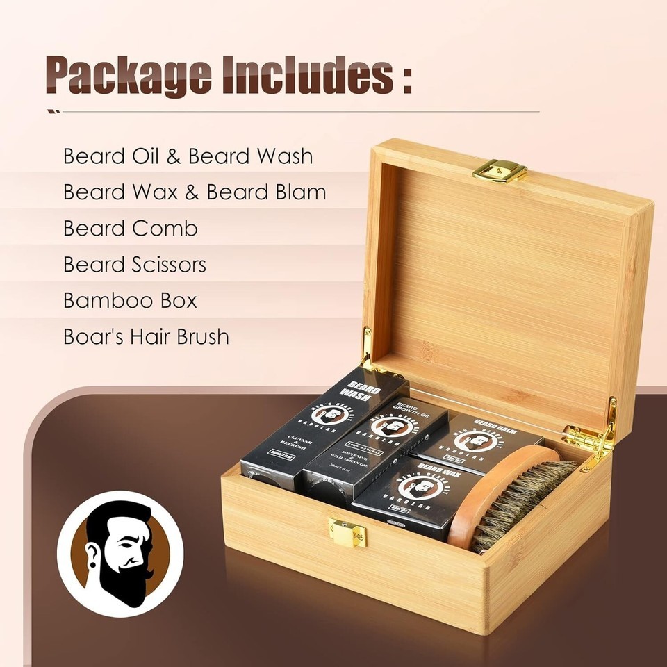 Contents: Beard oil, balm, wax, wash, wooden comb, boar bristle brush, scissors, and a beautifully crafted bamboo storage box.