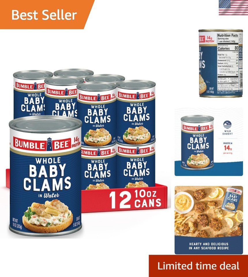 Ready to Eat Whole Baby Clams, 10 oz Cans (12 Pack) - Perfect for Meals Snacks